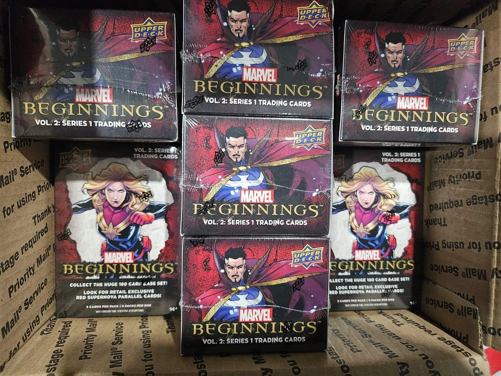 Get ready for an epic adventure with the MARVEL BEGINNINGS Volume 2 Upper Deck Series 1 Blaster Box. This lot of 8 boxes is perfect for fans of the Marvel Cinematic Universe, featuring a variety of non-sport trading cards from the iconic franchise. Each box contains a selection of cards made from high-quality card stock, with a focus on superhero, action, and adventure genres. This configuration of boxes is ideal for collectors and enthusiasts alike, with a total of 8 boxes included in the lot. The cards within each box are perfect for adding to your collection or trading with fellow fans. Don't miss out on this amazing opportunity to own a piece of the Marvel universe.