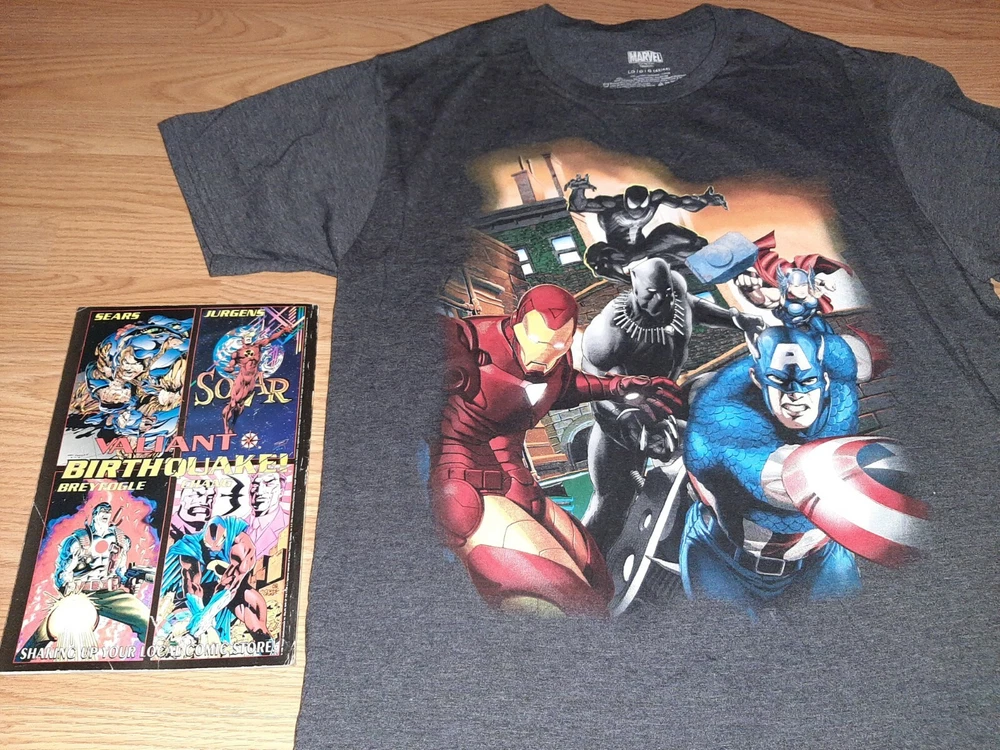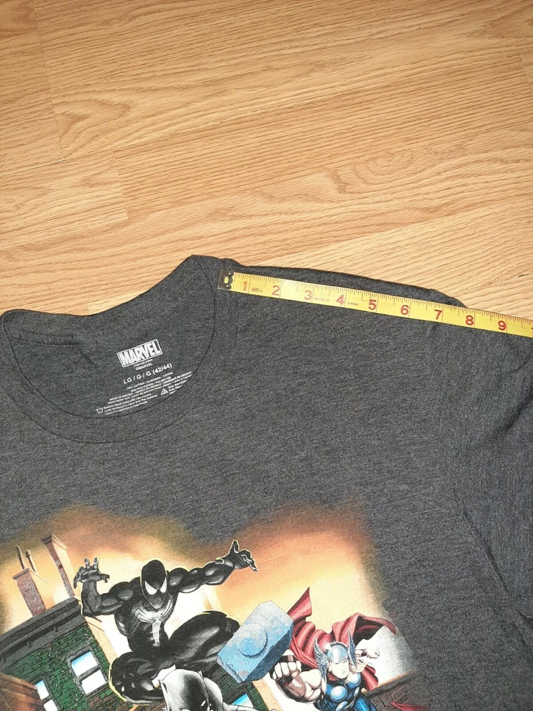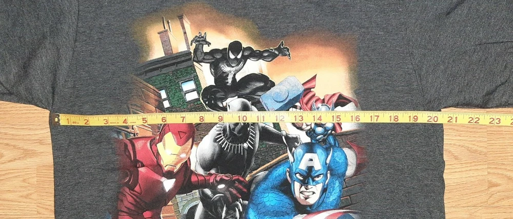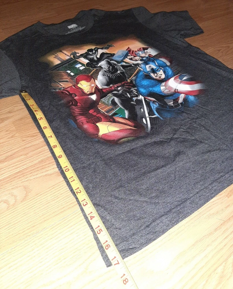 Show off your love for Marvel with this grey men's T-shirt featuring iconic characters Captain America, Black Panther, and Spider-Man. The shirt is made of a cotton blend and features a crew neck and short sleeves. It is a vintage style that can be worn for all seasons, including winter, summer, fall, and spring. The shirt is machine washable and easy to care for, making it a great addition to any casual wardrobe. Its solid pattern and breathable material make it a perfect fit for any Marvel fan looking for a comfortable and stylish shirt.