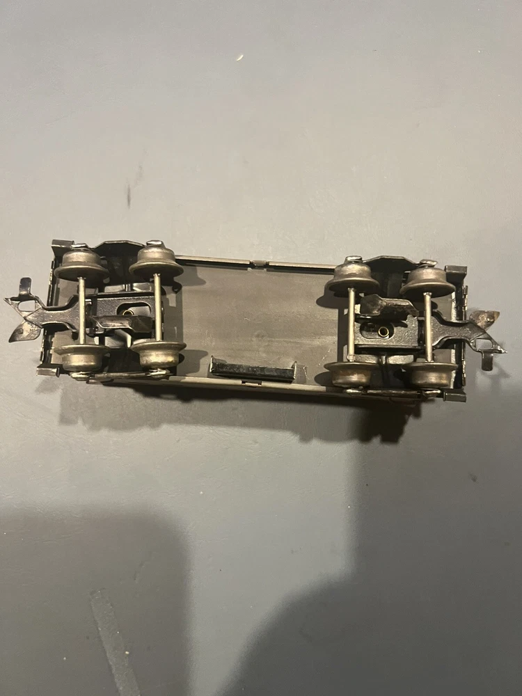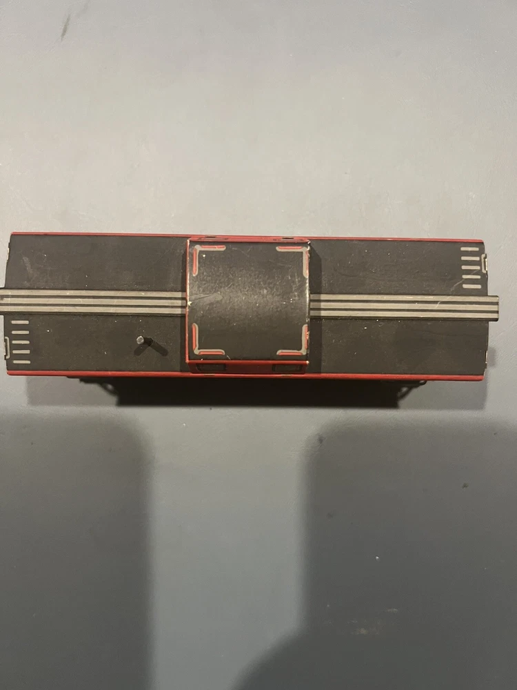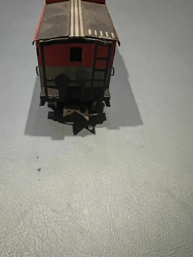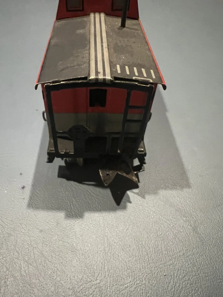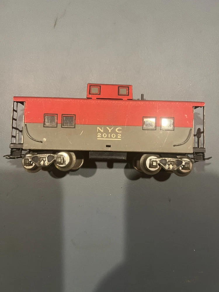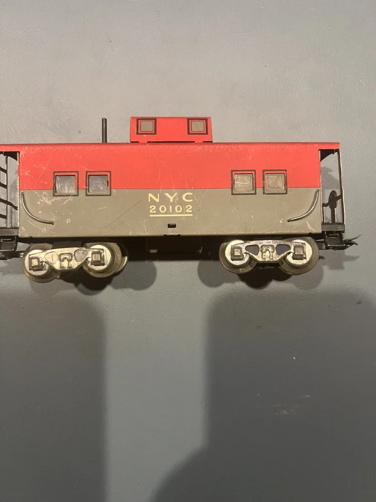 The MARX Deluxe 7" Caboose is a vintage O-27 gauge model train accessory manufactured in 1941. This replica of the Pacemaker Merchandise Service features metal Tilt-fork couplers, Marx Type-B trucks, and a red & gray tin lithograph design. Made of pressed steel and tin, this 1:48 scale caboose is a part of the New York Central corporate roadname collection. It is ready to go, pre-built, and weighs approximately 1 lb, making it a valuable addition to any model railroad enthusiast's collection. Some scratches, dings and wear. Nothing that takes away from the caboose. Ready to add to your collection.