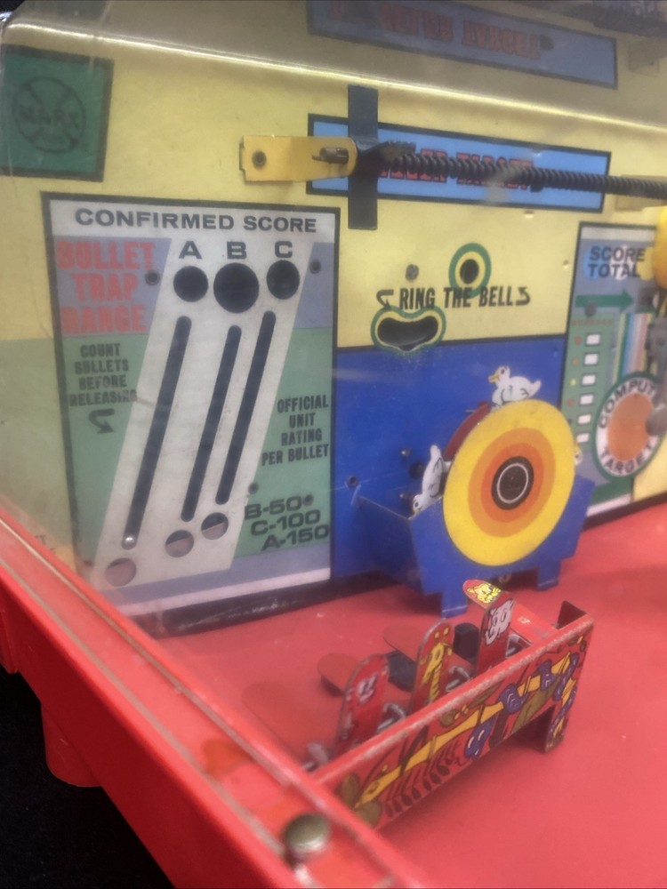 The MARX Electro Shot Arcade Shooting Gallery from 1960 is a vintage toy manufactured in the United States. This arcade-style shooting gallery is designed for children aged 8-11 years old and features a gun that is missing and being sold for parts only. The brand, Marx, is known for producing high-quality toys, making this vintage shooting gallery a desirable addition for collectors or enthusiasts of vintage and antique toys. Please note that is missing the gun. Please note that there are small cracks/scratches in the plastic Target winds up and moves Sold as is