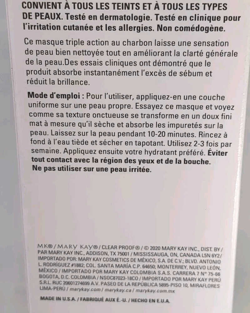 Skin Type:All Skin TypesScent:HerbalUPC:Does not applyCountry/Region of Manufacture:United StatesMain Purpose:Acne, Clogged PoresIngredients:Glycerin, WaterProduct Line:MARY KAY CLEARPROOF DEEP CLEANSING CHARCOAL MASKgtin13:Does not applyUVA Protection:n/aSize:RegularMPN:094148Sun Protection Factor (SPF):SPF 0Type:CHARCOAL FACE MASKVolume:4 OZ. NET WT. / 114 GBody Area:FaceActive Ingredients:Activated Charcoal, Kaolin and Bentonite Clays, Honeysuckle and Navy Bean ExtractsDepartment:UnisexSet Includes:N/AExpiration Date:CM15Period After Opening (PAO):36MBrand:Mary KayFormulation:Cream, MaskFeatures:Animal Cruelty-Free, DERMATOLOGIST-TESTED, NON-COMEDOGENIC