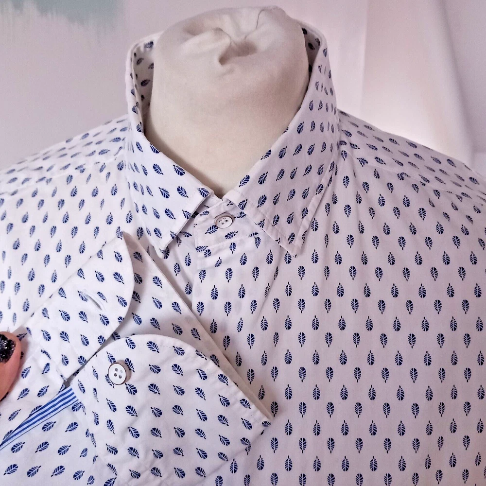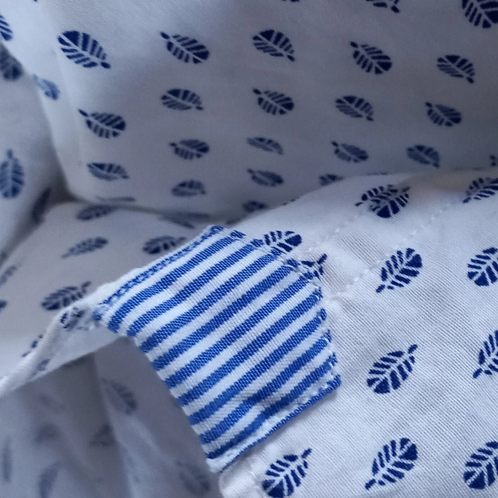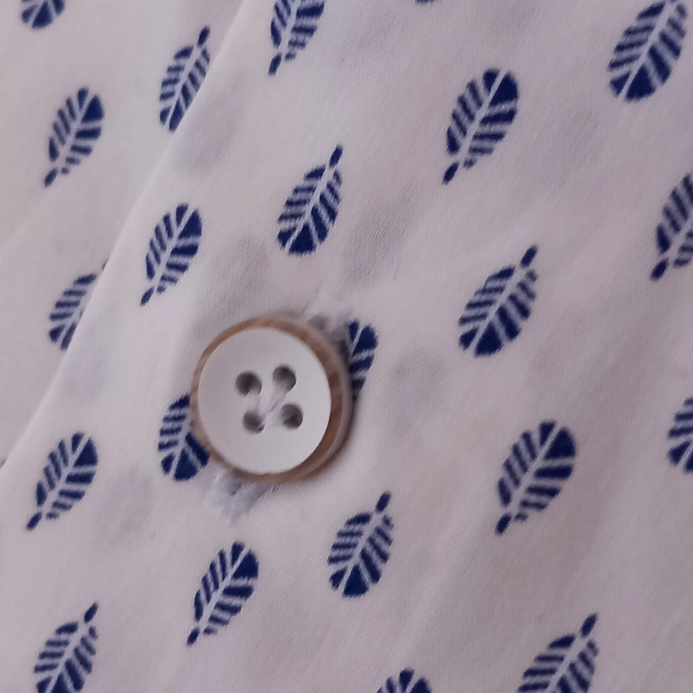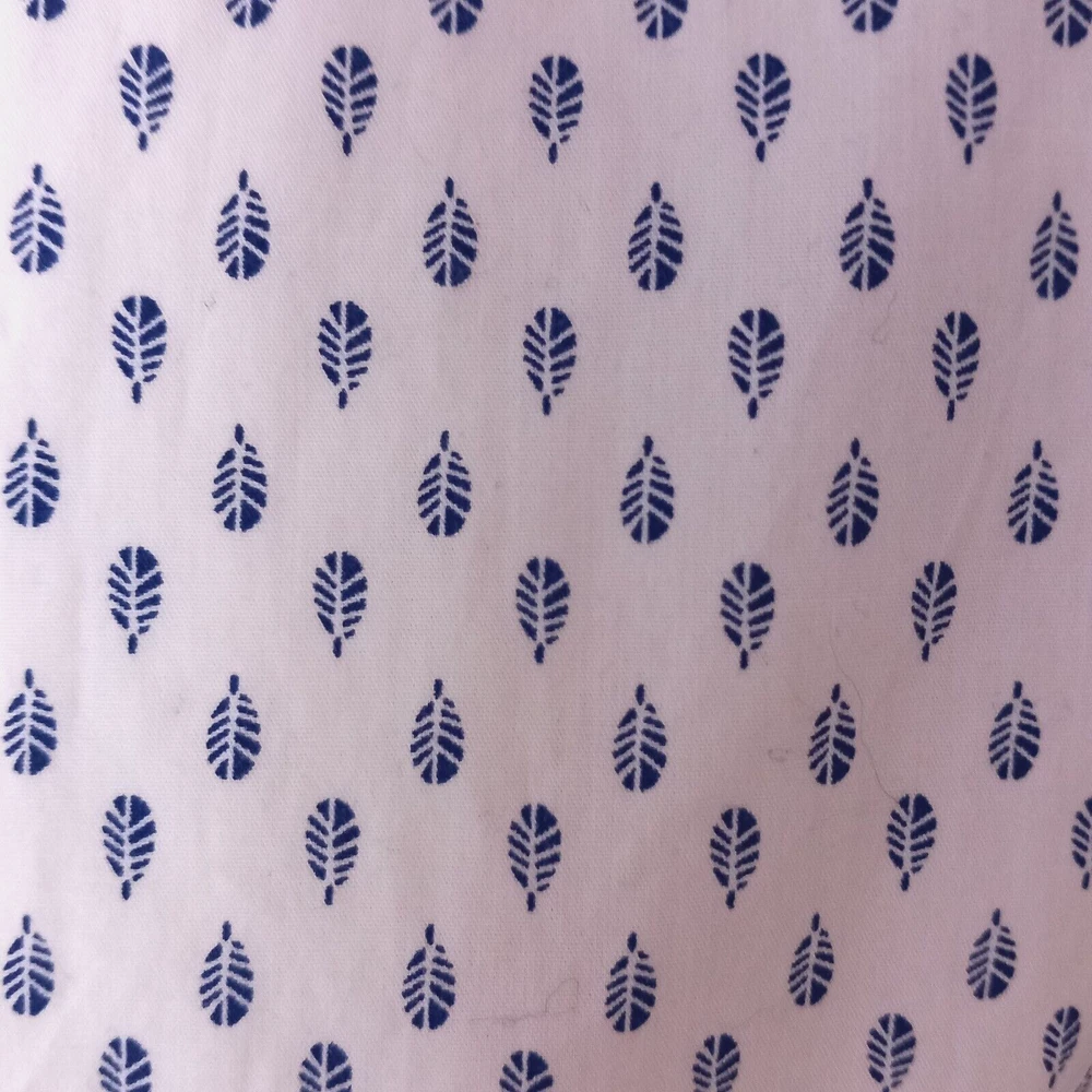 Gently used condition with no faults found. Measures 17" shoulder to shoulder seam, 21" pit to pit, 30" nape to hem, 25" sleeve. 100% cotton. White background with blue leaf or feather design.