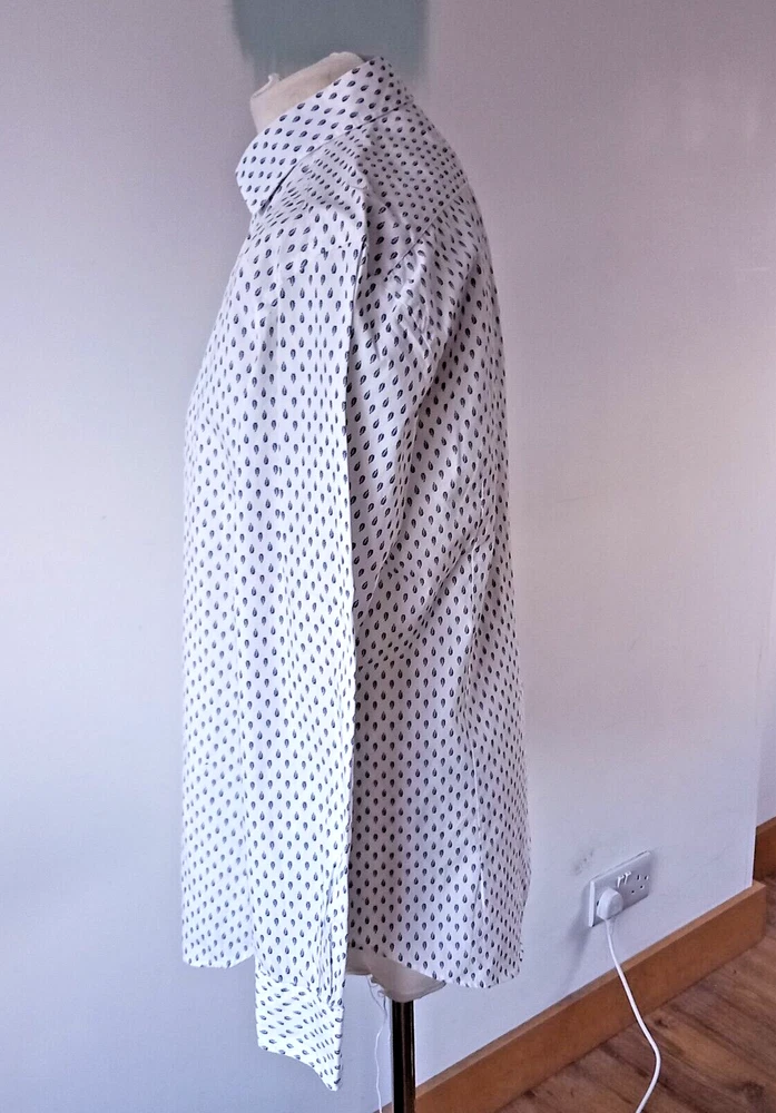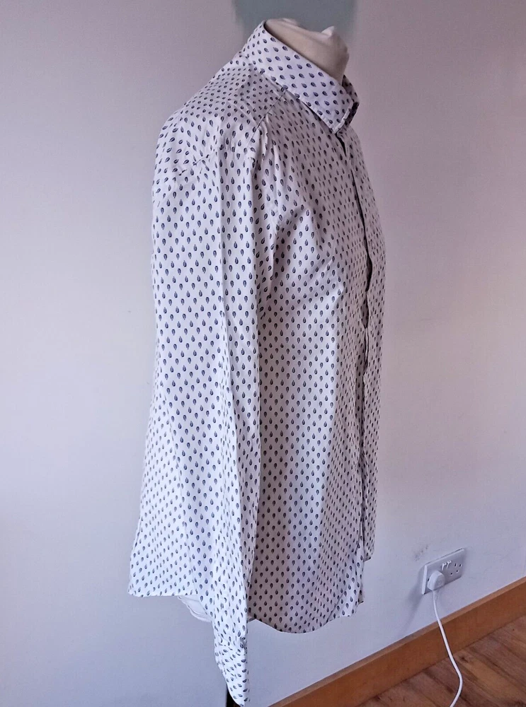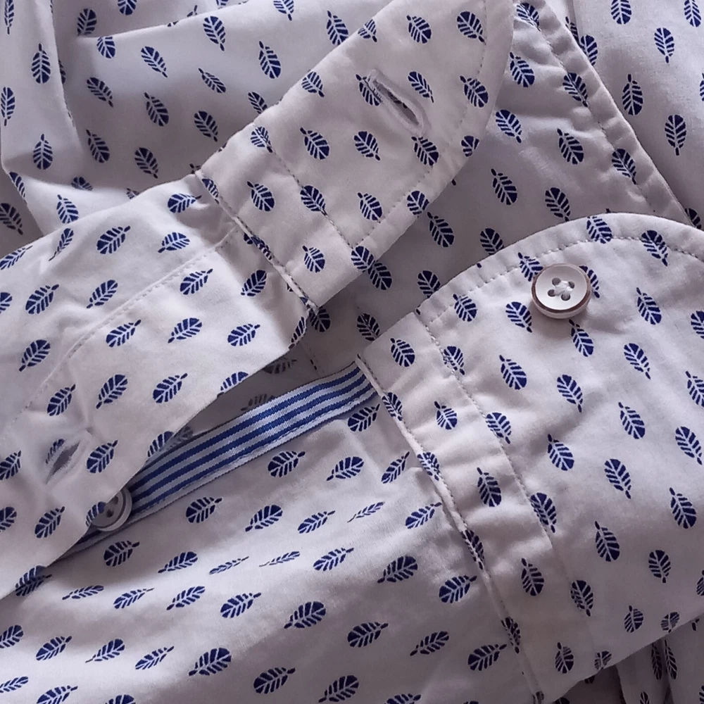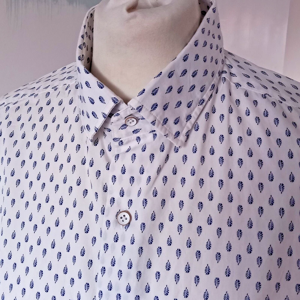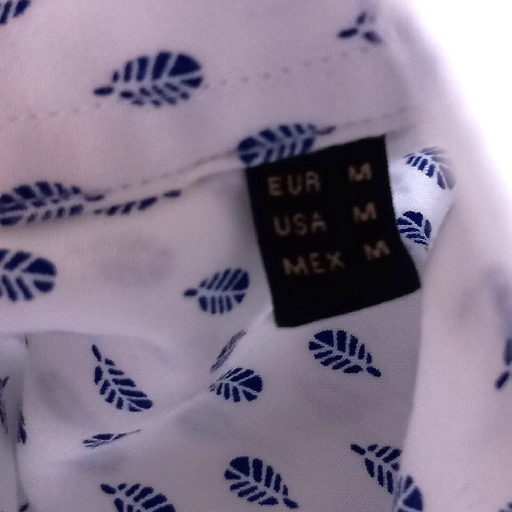 Gently used condition with no faults found. Measures 17" shoulder to shoulder seam, 21" pit to pit, 30" nape to hem, 25" sleeve. 100% cotton. White background with blue leaf or feather design.