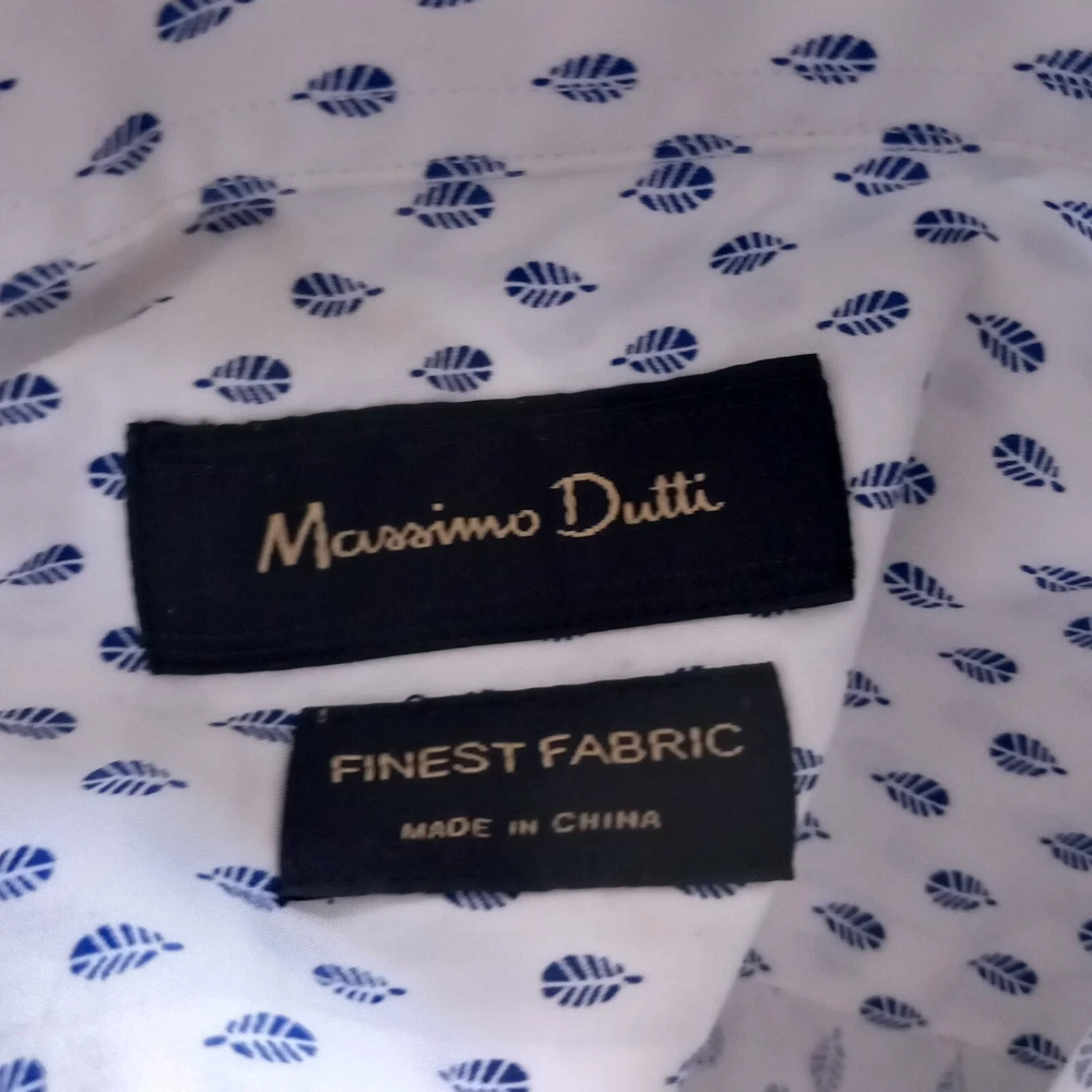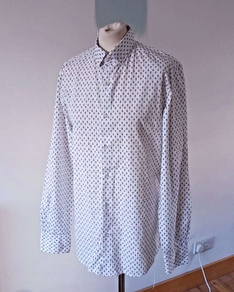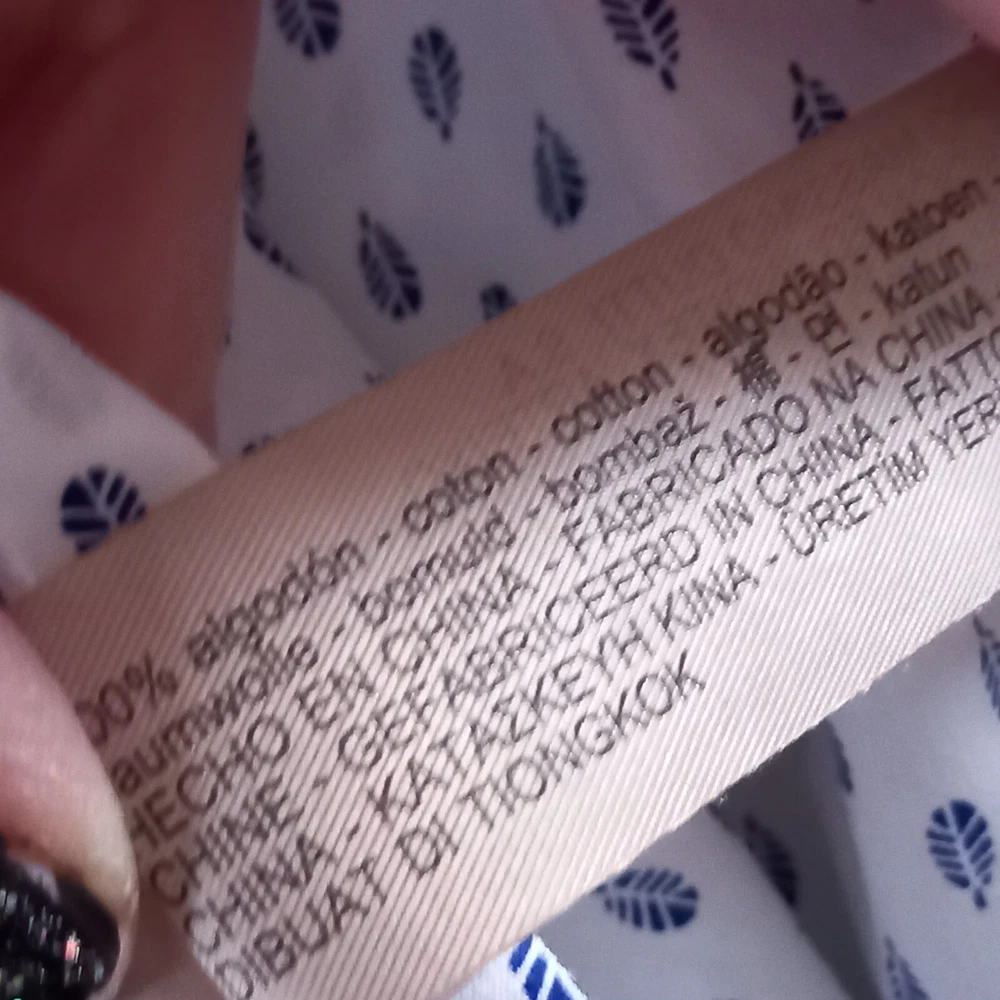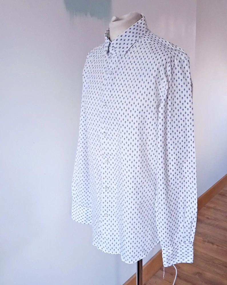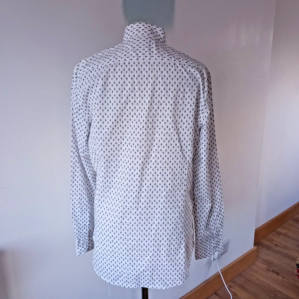 Gently used condition with no faults found. Measures 17" shoulder to shoulder seam, 21" pit to pit, 30" nape to hem, 25" sleeve. 100% cotton. White background with blue leaf or feather design.