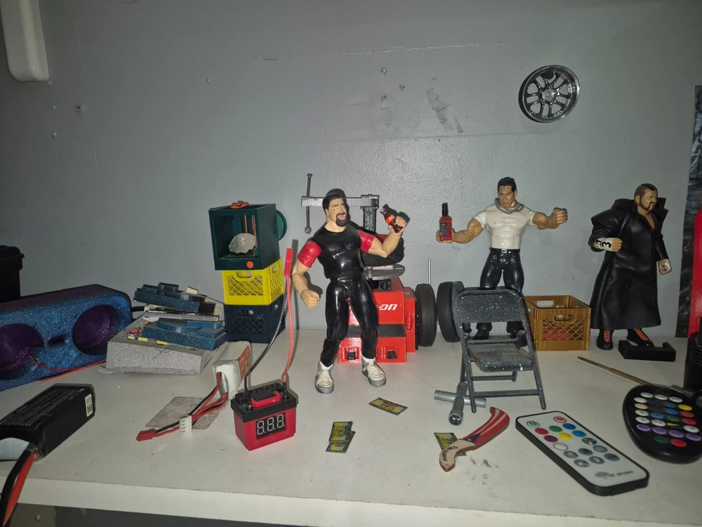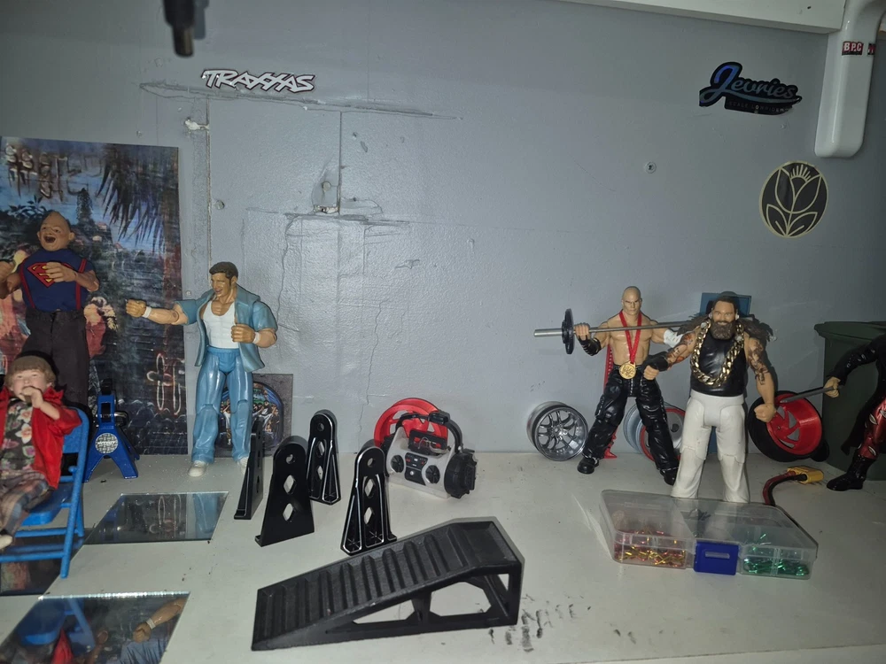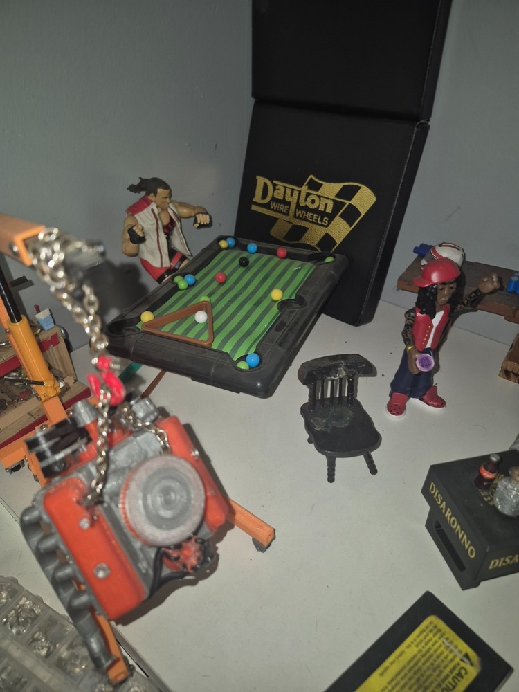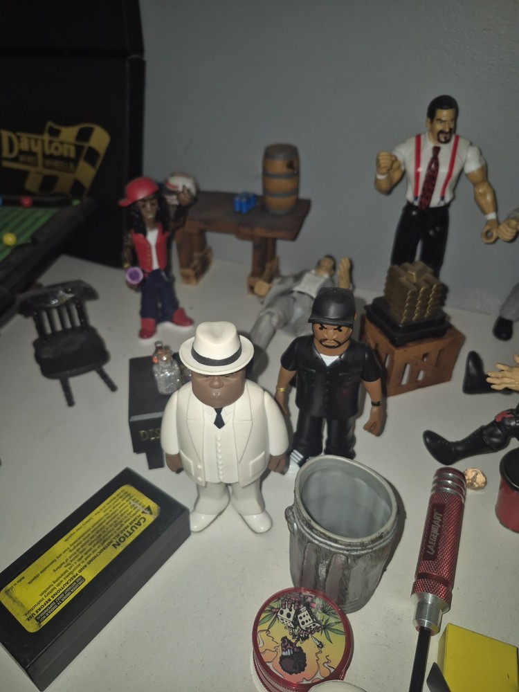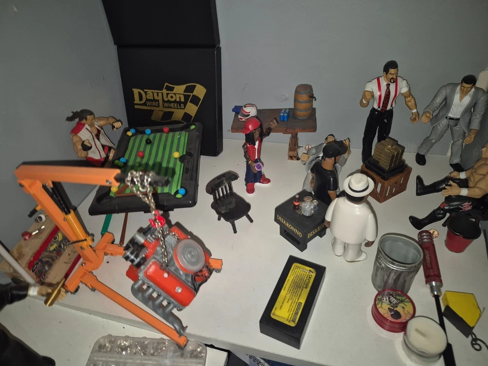MASSIVE 1/10 SCALE DIORAMA ACCESSORY LOT – 26 FIGURINES + over a hundred OF UNIQUE PROPS! 🔥One-Shot Deal – Everything Goes Together! Up for sale is an incredible, one-of-a-kind diorama bundle perfect for 1/10 scale RC cars, garage scenes, street sets, hobby displays, photo shoots, and collectors. There is MUCH more included than what’s listed here — be sure to look closely at all the pictures to see the full variety.What’s Included (Highlights): 26 figurines all with accessories featuring iconic characters like: Biggie Ice Cube Chunk (The Goonies!)And many more unique street-style and character figures Snap-On style shop accessories Pool table + chairs Dog fight scene accessories (dogs, chains, props) Tons of miniature lifestyle items: Custom jewelry pieces Beer bottles Nike boxes Playstation Engine hoist (that alone is $60) Boomboxes Sneakers Candy bars Chips Corn roll Little chickens And dozens of additional micro-details This set is loaded with rare, fun, and highly detailed items—perfect for filling up a diorama, building a garage scene, or giving your RC display a ton of personality.ConditionEverything shown comes exactly as pictured. Some items are custom-made. All pieces sold as a complete lot only—no splitting.Why This Lot Is SpecialYou are getting way more than just 26 figures. There are hundreds of tiny accessories that make this set truly stand out. It’s nearly impossible to list every item — the photos tell the full story.If you want a full scene ready to go, this is the bundle.