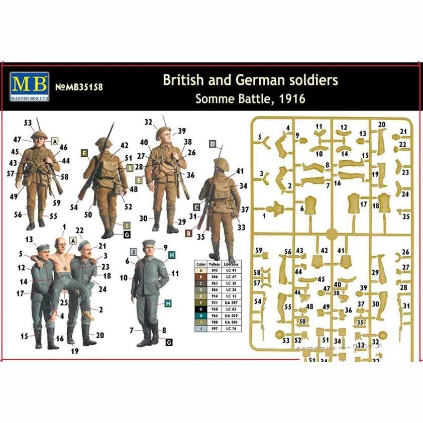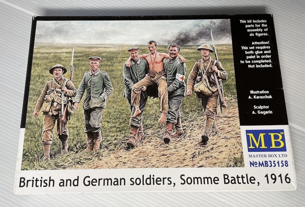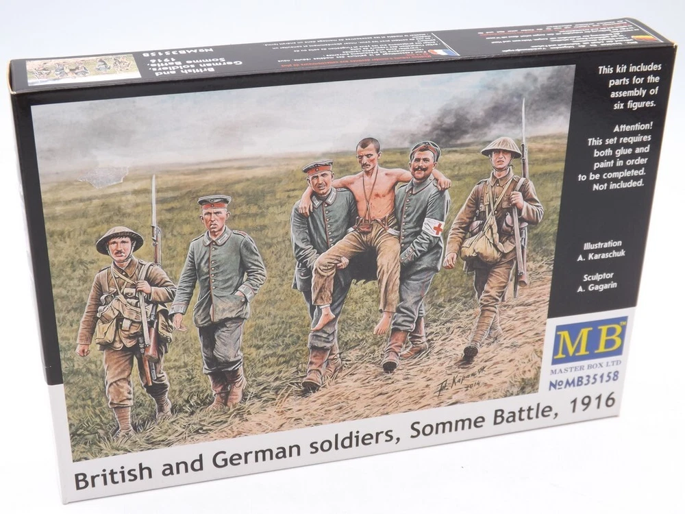 MASTER BOX MB35158 Scale Figure Kit 1:35 British and German soldiers, Somme Battle, 1916 - Plastic model kit ---------------------------- If you have a desire to procure a GREATER NUMBER OF ITEMS THAN WHAT IS CURRENTLY DISPLAYED, kindly let us know, and we will happily modify our offerings to suit YOUR EXACT QUANTITY NEEDS. ---------------------------- Scale: 1:35 Manufacturer: Master Box (Ukraine) Country/Region of Manufacture: Ukraine Condition: New in Box Features: Kit Series: World War I era / Scale Figure Kit Figures are not painted Glue and paint are not included The model is suitable for experienced and beginner modelers. ---------------------------- Scale model kits are a great way to create something truly unique and special. Whether you're a beginner or an experienced modeler, we have the perfect kit for you. Our kits are made from high-quality materials and come with detailed instructions, so you can be sure to create a masterpiece. We also offer a variety of accessories and tools to help you customize your model to your liking. With our scale model kits, you can bring your imagination to life. Build your favorite car, plane, or train. Create a replica of your favorite historical figure. Or even build something completely original. No matter what you choose to build, you're sure to have a rewarding and enjoyable experience. So what are you waiting for? Start building your masterpiece today!