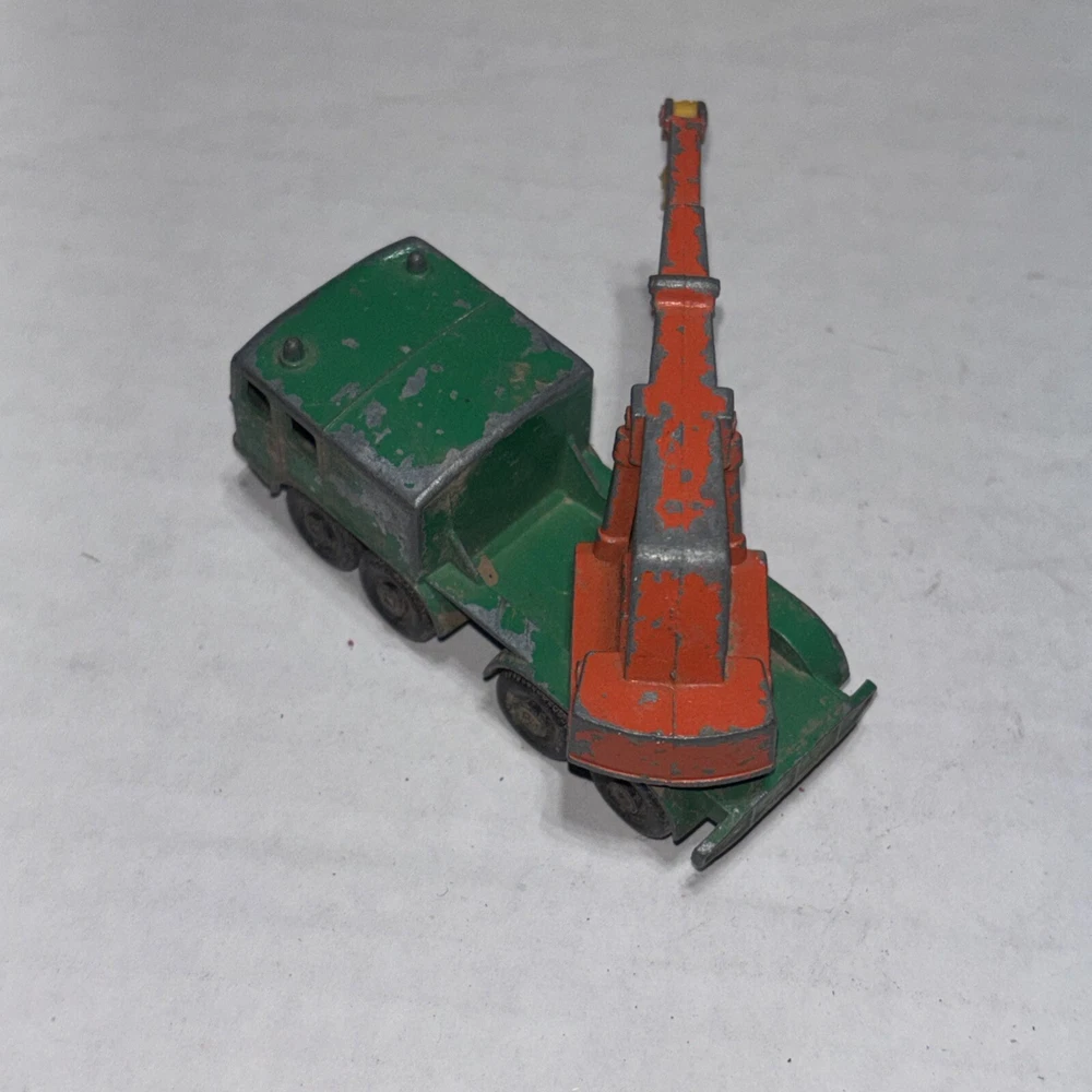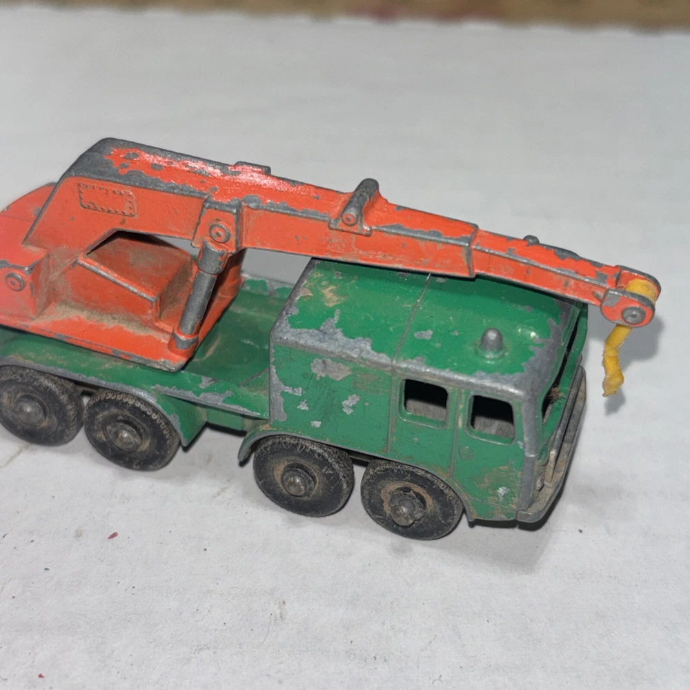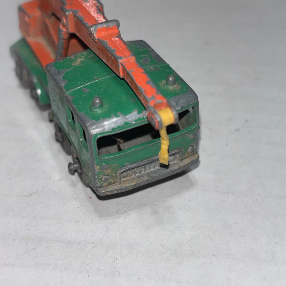 The MATCHBOX Lesney 8 Wheel Crane Truck is a vintage diecast toy car from 1961, part of the Matchbox 1-75 series. It is a 1:64 scale model of a Magirus crane truck in green and orange colors, made of Zamak material. This non-domestic vehicle is designed for children aged 4-7 years old, featuring a construction theme with realistic crane details. This collectible item was manufactured in the United Kingdom and is a classic piece for vintage toy and diecast vehicle enthusiasts.