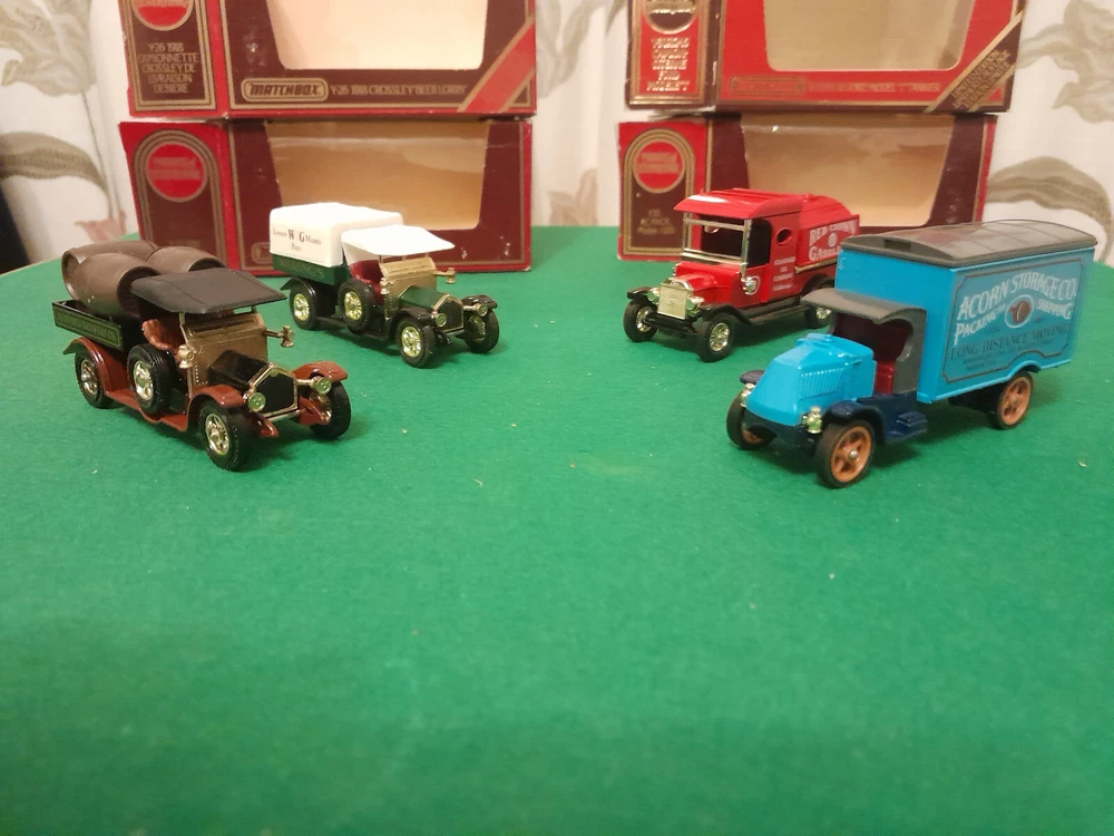 4 X MATCHBOX MODELS OF YESTERYEAR , Y13 1918 CROSSLEY WARINGS, Y 3 1912-16 FORD MODEL T TANKER, Y 30 1920 MODEL AC MACK ACORN STORAGE CO , Y26 1918 CROSSLEY " BEER " LORRY .ALL IN VERY GOOD CLEAN NO DAMAGE CONDITION. WE WILL COMBINE POSTAGE AND WE CAN DO TWO SETS OF 4 VEHICLES FOR THE ONE LOT OF POSTAGE.