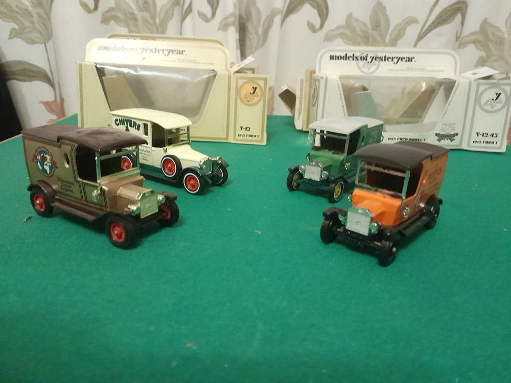 4 X MATCHBOX MODELS OF YESTERYEAR , Y 12 1912 FORD MODEL T 25 YEAR OF MODELS OF YESTERYEAR, Y12 1912 FORD MODEL T THE HOOVER VACUUM CLEANER ,Y12 FORD MODEL T MOTOR 100 SILVERSTONE CIRCUIT , Y5 1927 TALBOT CHIVERS & SONS LTD ..ALL IN VERY GOOD CLEAN NO DAMAGE CONDITION. WE WILL COMBINE POSTAGE AND WE CAN DO TWO SETS OF 4 VEHICLES FOR THE ONE LOT OF POSTAGE.