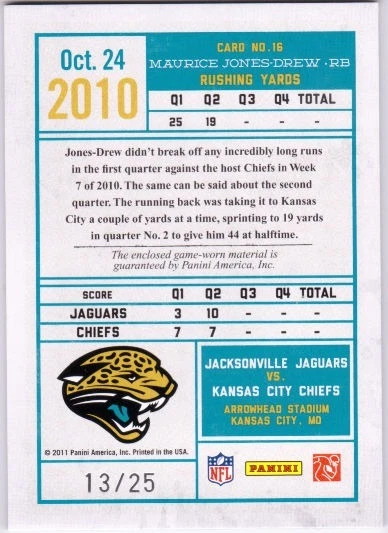 MAURICE JONES-DREW 2011 Timeless Treasures Game Day Prime Jersey Qtr 2 Card /25 SKU: SIN00924MJD Brand: Timeless Treasures Condition: Pre-owned Card Attributes: Piece of Authentic*Serial Numbered Card Manufacturer: Panini Year: 2011 Original/Reprint: Original Product: Single-Insert Era: Modern (1970-Now) Team: Jacksonville Jaguars Player: Maurice Jones-Drew League: NFL Sport: Football Professional Grader: Not Professionally Graded Grade: Ungraded Year/Season: 2011 Manufacturer: Panini Serial Numbered: 13/25 Autographed: false Game Used: Game Used Condition Provided By : Seller Condition Rating: Mint Pictures are scans of the exact card you will receive. All items come from our SMOKE-FREE Heroes Sports Cards retail store. Thanks for looking!