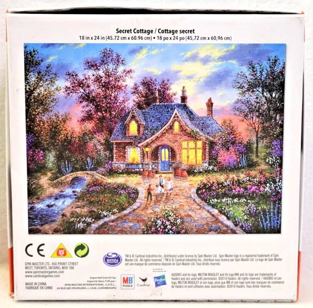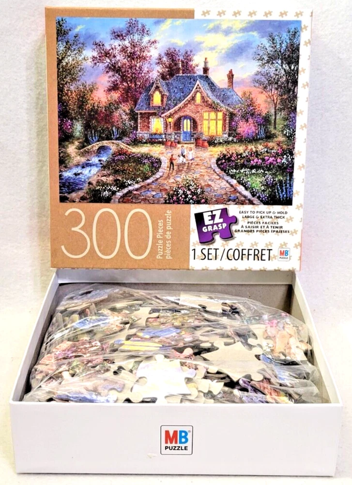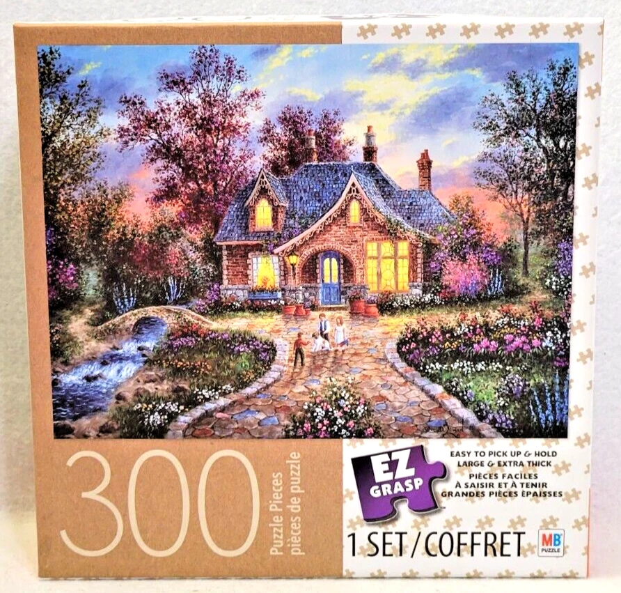 This 300-piece puzzle from MB/Cardinal titled "Secret Cottage" features a beautiful landscape of a cozy cottage surrounded by trees and flowers. The completed size is 18" x 24" and the puzzle is recommended for ages 8 and up. It comes with easy-to-grasp pieces and is made of cardboard. The puzzle is perfect for puzzle enthusiasts who love the comfort of quiet cottages. It is made in the United States and can provide hours of entertainment for all ages. Add it to your collection of contemporary puzzles today! Doing puzzles has some hidden benefits . Excellent qualities : Cultivate concentration, patience, and temper your will Movement development : Train hand-eye coordination and precise small movements Spatial intelligence : Improve visual discrimination of colors and shapes Critical thinking ability : Understand the relationship between parts and the whole, and draw inferences from one example to explore the future Relaxes your mind : Relieve work pressure and release yourself Brain development : Enhance memory and may help prevent or slow brain degeneration Each item we ship is carefully packaged to prevent any damage and is shipped immediately with tracking.