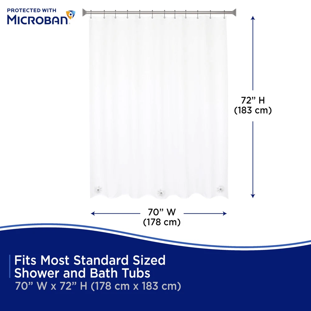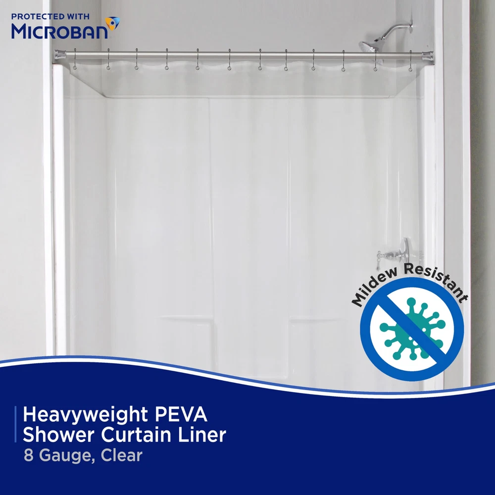 The Heavyweight PEVA Shower Liner Protected with Microban antimicrobial technology inhibits the growth and reproduction of odor-causing bacteria, mold and mildew and provides enhanced product protection from microbes. Microbes can cause staining and noxious odors – less microbes equals a fresher product! Protected with Microban, this Shower Liner will remain antimicrobial for the expected product lifetime – the antimicrobial properties will not wear off or wash away. The Shower Liner is made of environmentally friendly PEVA, making it PVC-free and odorless. The liner has 12 rust-resistant metal grommets to prevent tearing from shower hooks and rings. The weighted hem on the waterproof liner keeps the liner from billowing and in place. Standard sized, this liner measures 70 inches wide by 72 inches tall (178 cm x 183 cm) to fit most showers and bath tubs. Protected with Microban: The Microban additive inhibits the growth of stain and odor-causing bacteria, mold and mildew, and provides enhanced product protection Antimicrobial & Mildew-Resistant Product: Products stay cleaner in-between cleanings, complementing existing cleaning practices Built-in Lifetime Performance: Products remain antimicrobial for their expected lifetime – the properties will not wear off or wash away Reduces Odor-Causing Bacteria: Microbes can cause staining and noxious odors – less microbes equals a fresher product Eco Friendly: Heavyweight PEVA shower liner is PVC-free, environmentally friendly, and odorless Rust-Resistant Metal Grommets: Enhanced strength is resistant to tears Weighted Bottom Hem: Keeps liner in place and water inside the tub Standard Size: 70" W x 72" H (178 cm x 183 cm) fits most bath tubs and showers