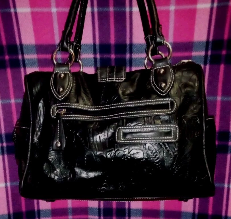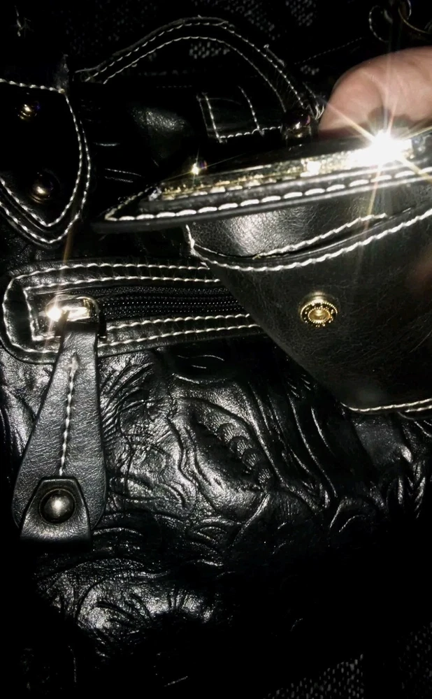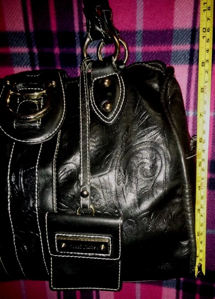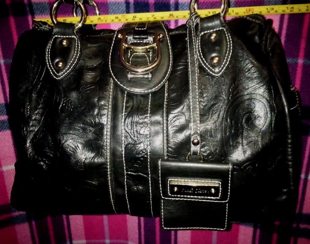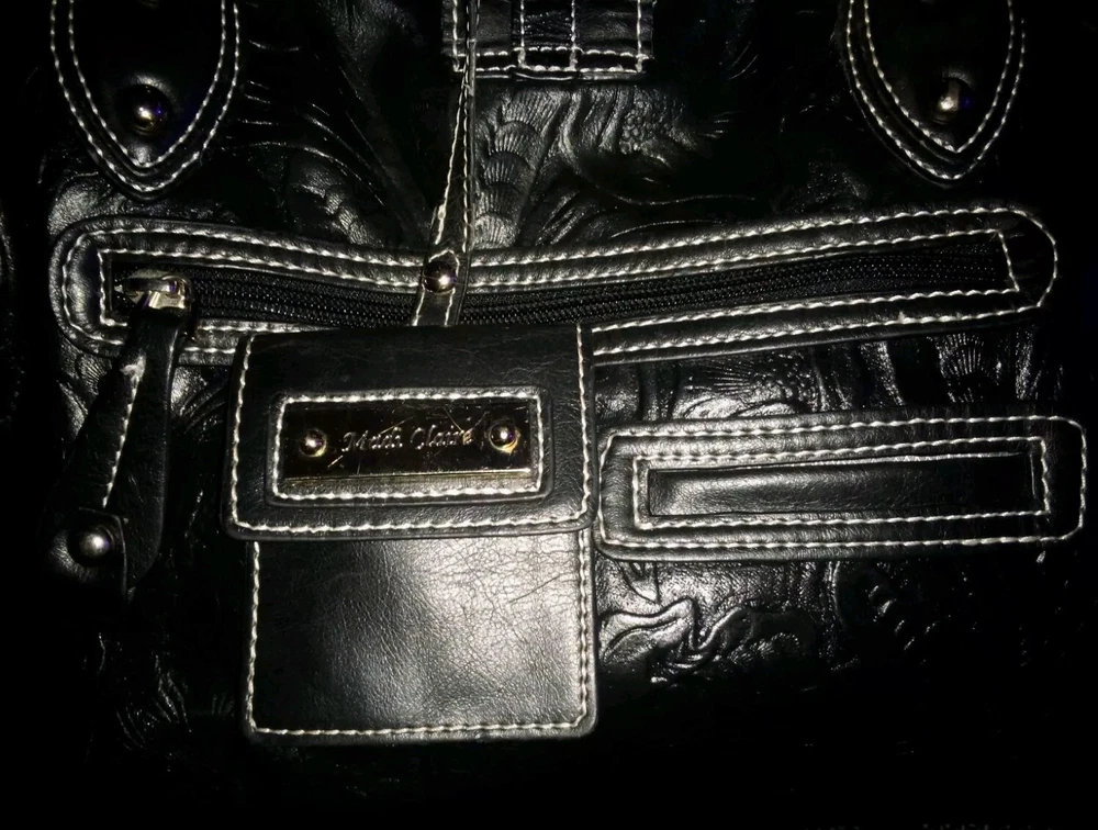 Elevate your style with the MC Madi Claire Crossbody Handbag, a sophisticated accessory that marries functionality with high-end fashion. Crafted from premium black leather and stamped with a chic floral pattern, this medium-sized bag boasts a trapezoid shape that's as versatile as it is trendy. It's fully equipped with a variety of features including a removable pouch, adjustable strap, and multiple pockets to keep your essentials organized and within reach. The handbag's interior is lined with silver satin, providing a luxe touch to your personal items. The gold hardware adds a touch of elegance, while the black leather handle and strap ensure comfort and durability. Whether you're headed to the office, attending a cocktail party, or traveling, this bag is designed to complement any occasion. It's a piece that's both timeless and contemporary, making it a must-have for any fashion-conscious individual.