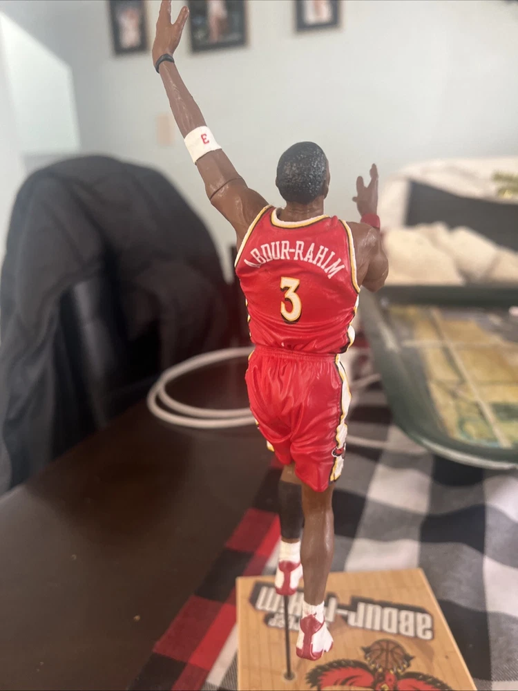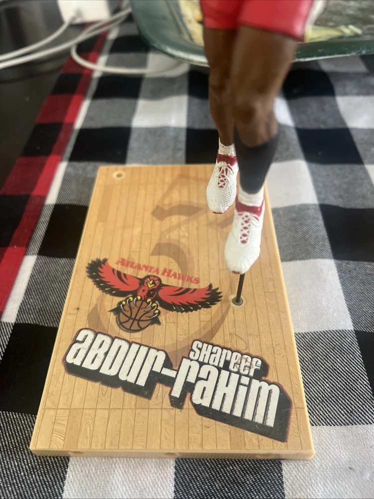 The McFarlane Atlanta Hawks Shareef Abdur-Rahim action figure features the former basketball player in his Hawks uniform. This loose action figure is part of the McFarlane Toys collection and is a detailed representation of the character Hawk. Shareef Abdur-Rahim is the featured person/artist for this figure, capturing his likeness and iconic look during his time with the Atlanta Hawks.