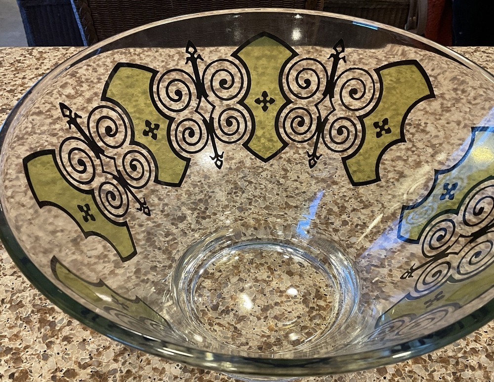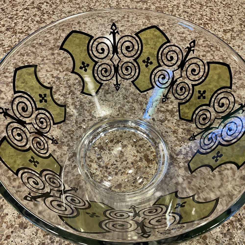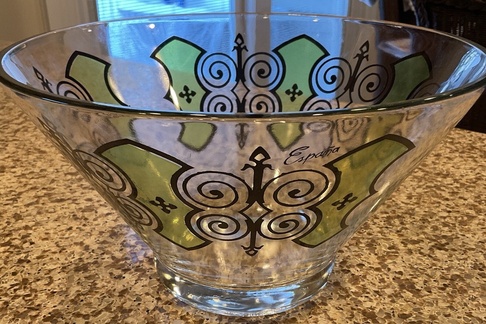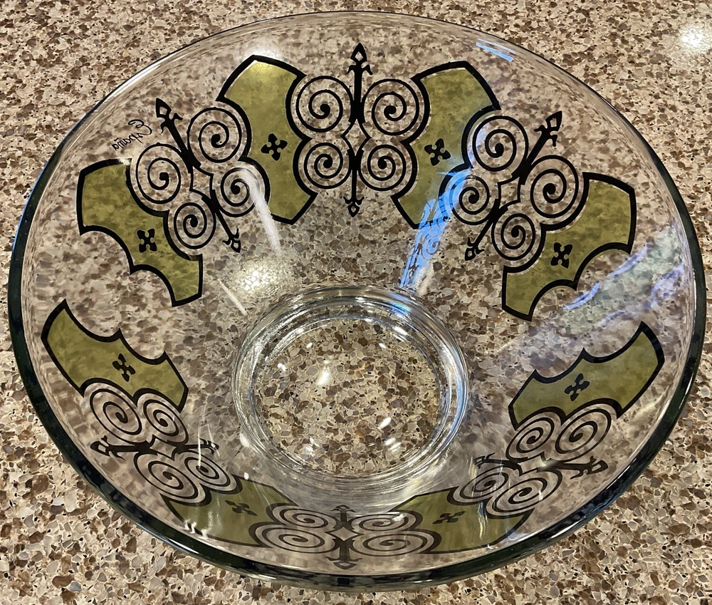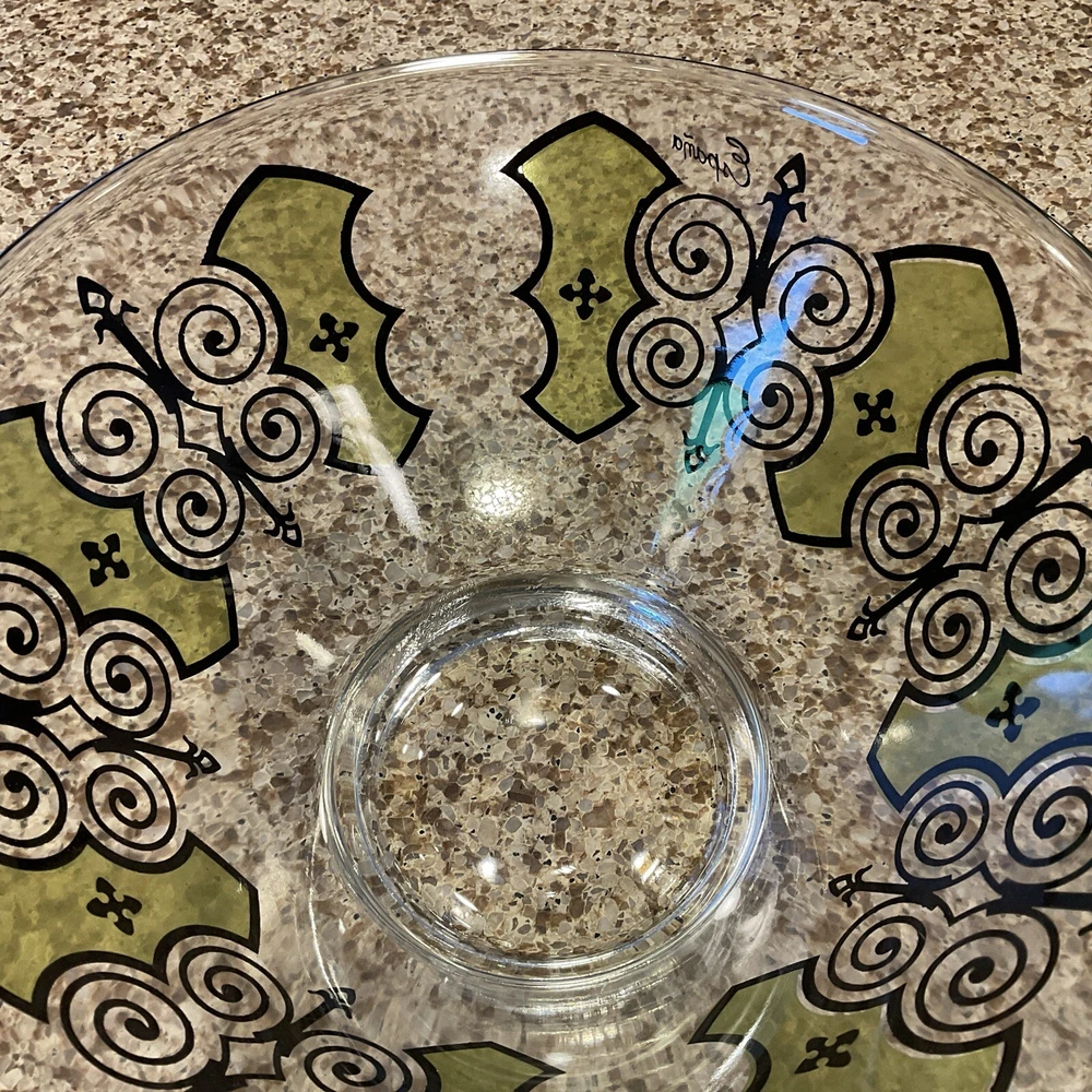 Elevate your serving game with this stunning vintage MCM Anchor Hocking Espana Butterfly Serving Bowl. The multicolor design features a beautiful butterfly pattern that will captivate your guests and add a touch of elegance to any occasion. Made of high-quality glass, this serving bowl is perfect for hosting dinner parties, family gatherings, or even daily meals with your loved ones. Its unique product line and vintage appeal make it a must-have addition to your collection. This is in VERY GOOD condition, pattern seems to be fluid throughout bowl. Very heavy solid piece with thick glass base, which makes shipping slightly higher.