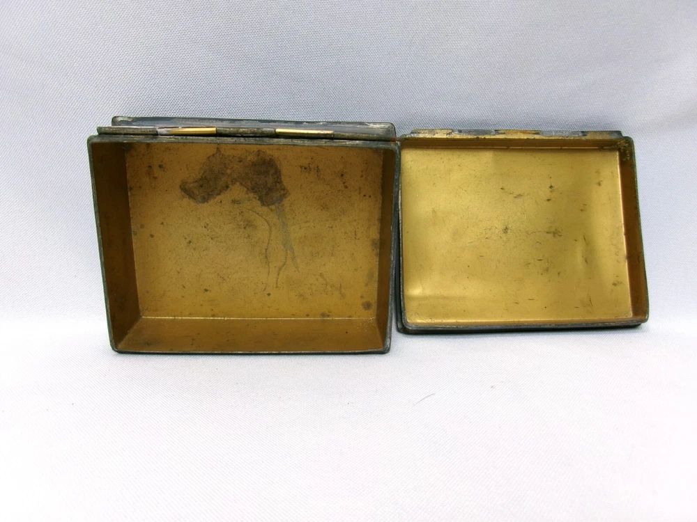 DETAILS · The outside looks like lead; The inside is gold-tone metal. Good vintage condition. The lid was once hinged to the box, but the hinge is broken off and now the lid simply lifts off (but fits nicely on the lip); Priced accordingly. There is very slight wear commensurate with age. I found no other notable flaws. Approx. 4” x 3 ¼” x 1 ¾” tall. - VISIT MY EBAY STORE! - I am selling many other vintage items and offer combined shipping; Message me for a quote. _____________________________ If there is any issue you are not happy with, please message me directly. I aim for 100% satisfaction! _________________________________________