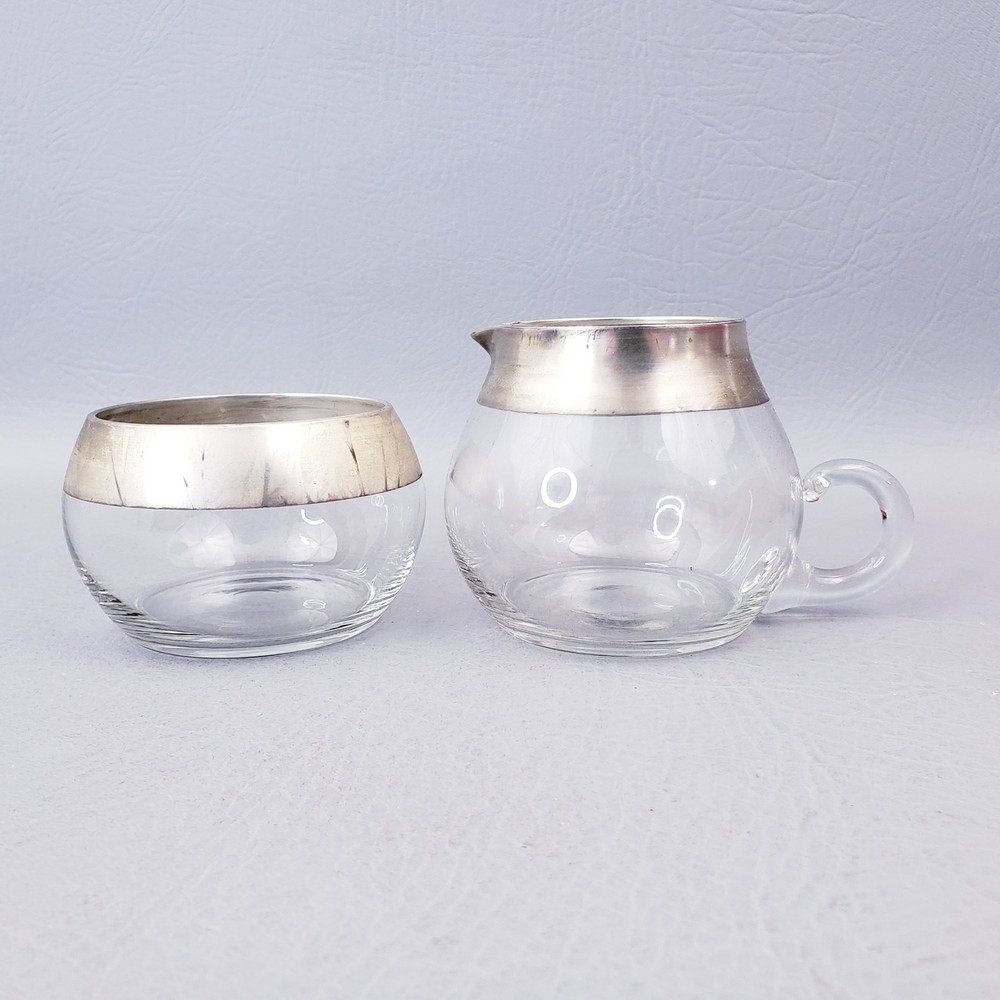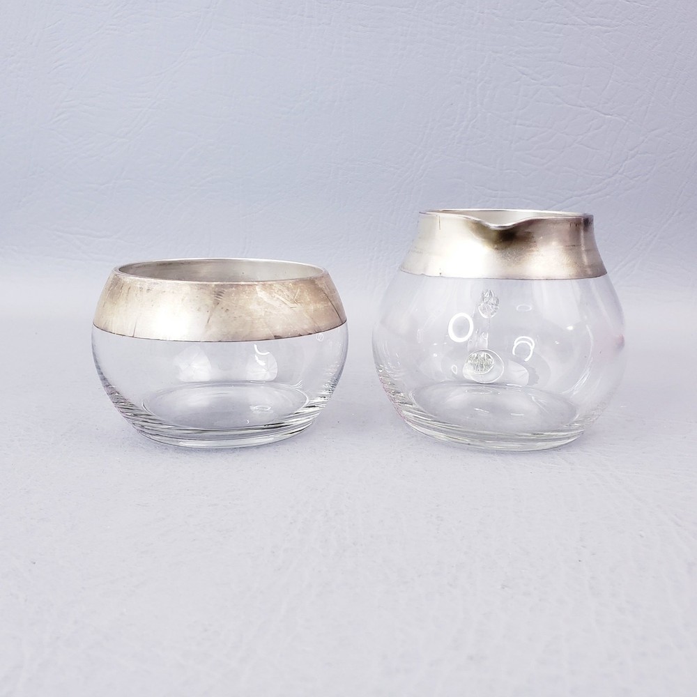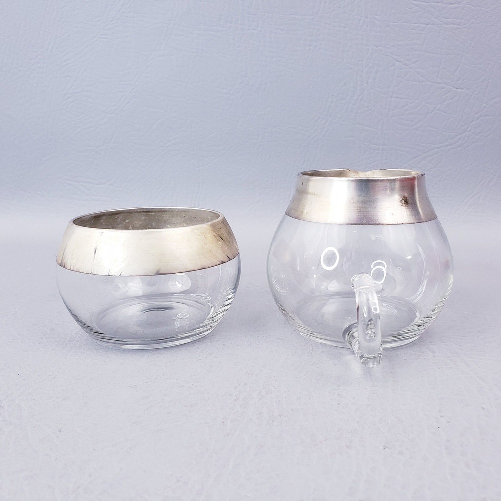 MCM DOROTHY THORPE ALLEGRO SILVER BAND 7 OUNCE MCM CREAM AND SUGAR SET Good pre-owned condition. Unpolished. Creamer, Sugar, and Spoon. Sterling dipped glass free of any chips or cracks. Original flocked Styrofoam box is missing label and has signs of storage. Please see the examples provided in the listing photos. Flocking is actively shedding which results in red powder on the contents that is easily cleaned off. Measure approximately 2 1/2" high 7oz capacity. Thank you for looking!