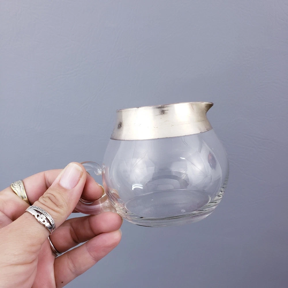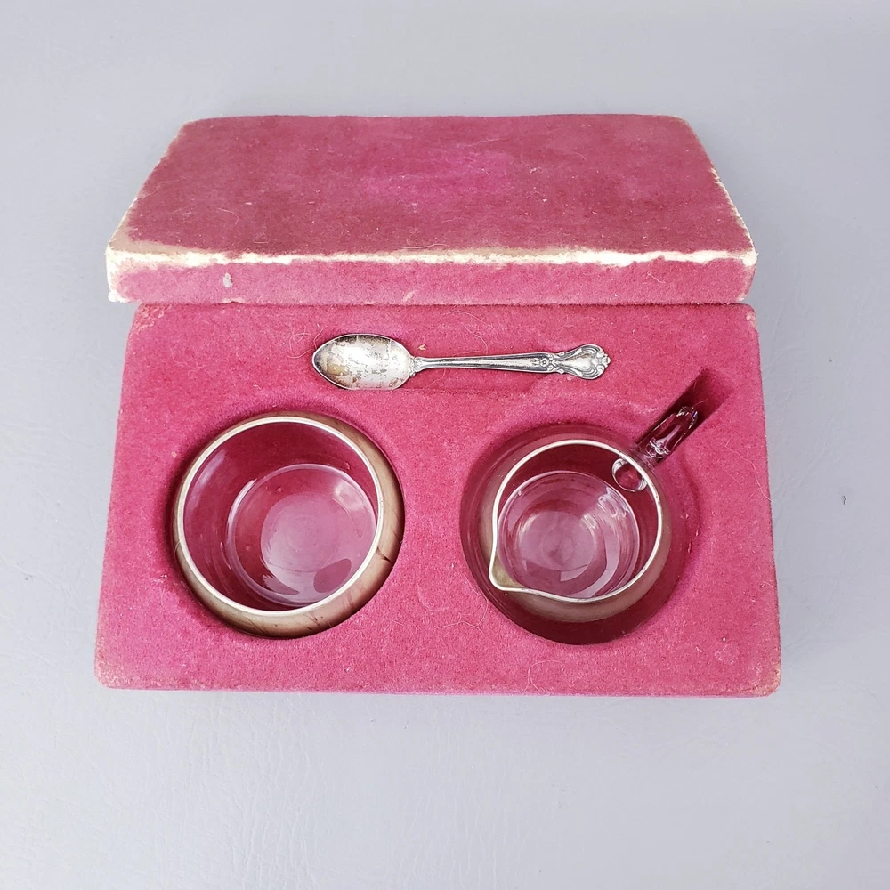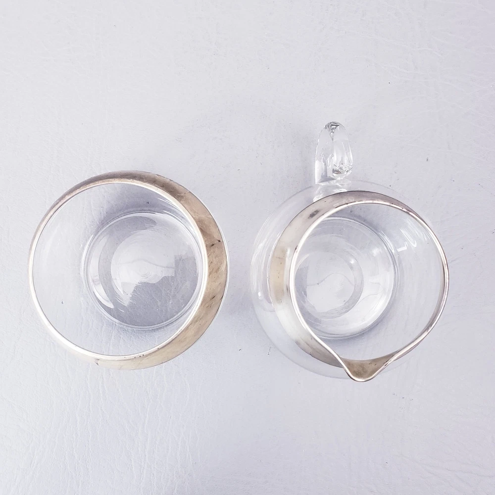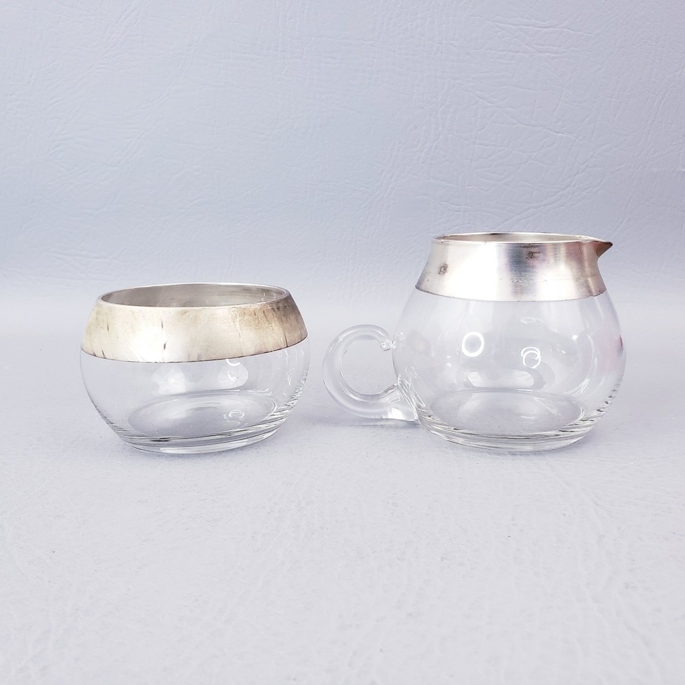 MCM DOROTHY THORPE ALLEGRO SILVER BAND 7 OUNCE MCM CREAM AND SUGAR SET Good pre-owned condition. Unpolished. Creamer, Sugar, and Spoon. Sterling dipped glass free of any chips or cracks. Original flocked Styrofoam box is missing label and has signs of storage. Please see the examples provided in the listing photos. Flocking is actively shedding which results in red powder on the contents that is easily cleaned off. Measure approximately 2 1/2" high 7oz capacity. Thank you for looking!