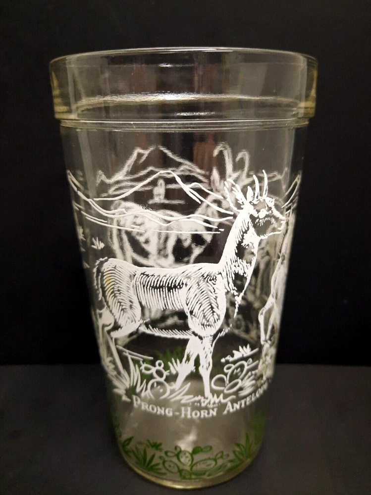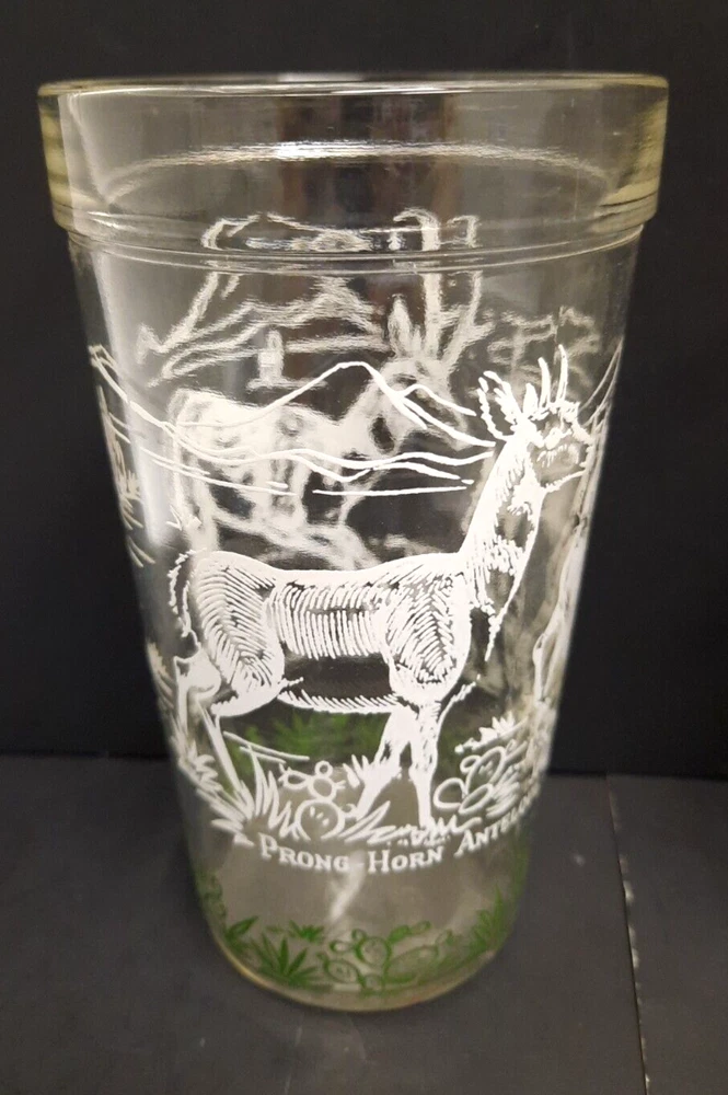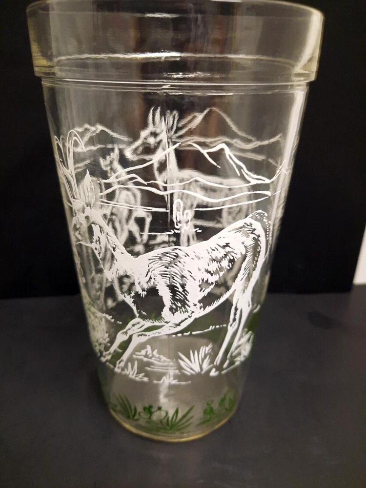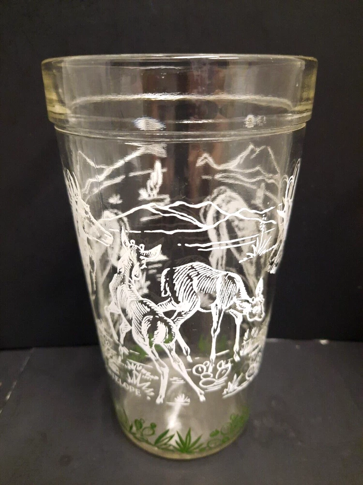 Set of 5 Vintage Hazel Atlas 'Prong-horn Antelope' 14/16 oz Glass Tumblers. They are 5 3/4" tall, 14 oz capacity. The glasses have a 'raised' white painted design on outside. The design is mostly in white, except for the grass & cactus along the bottom, which is green. There are outlines of mountains, cactus & other vegetation, 2 adult prong-horns & 2 babies on each glass. Handwriting is recommended. They are all in excellent condition.