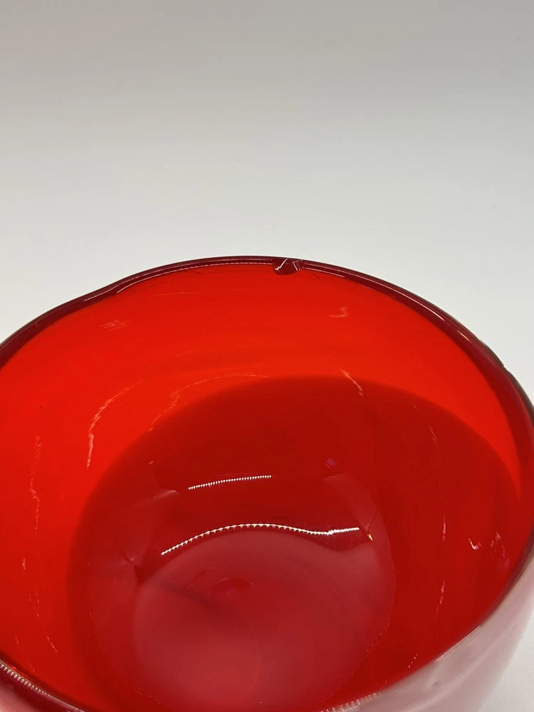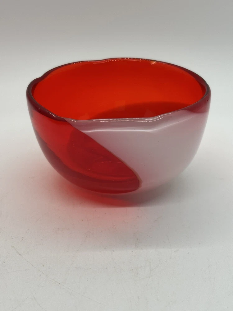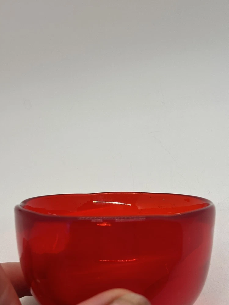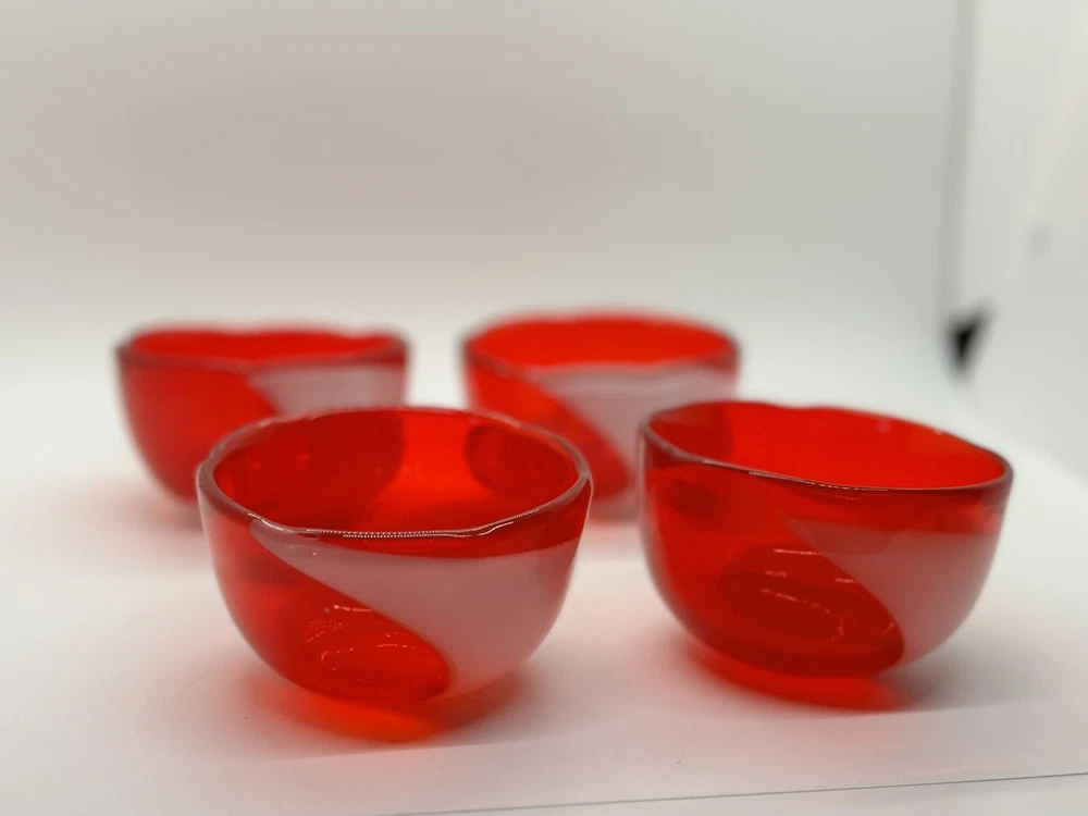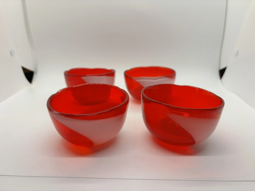 Beautiful set of 4 art glass tumblers / custard cups small bowls a slightly wavy edge A real feel of quality 3 inches across by 2 inches deep One has a chip as shown in last photo.