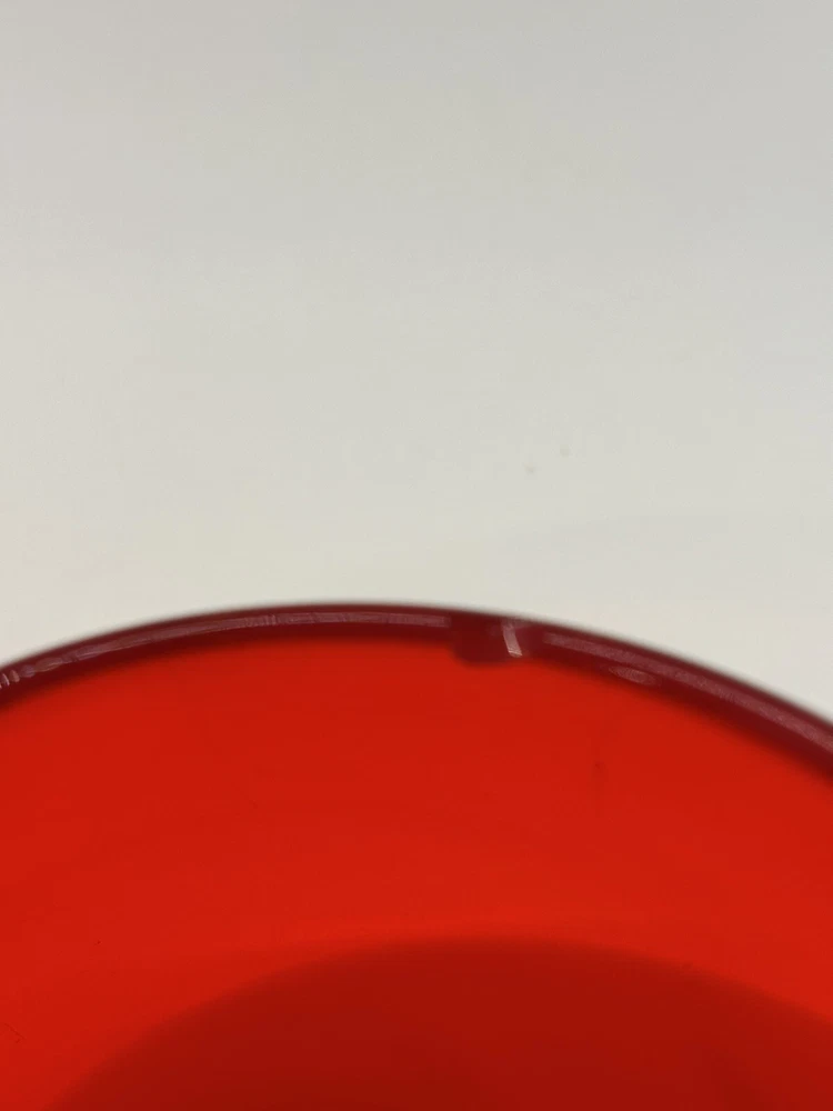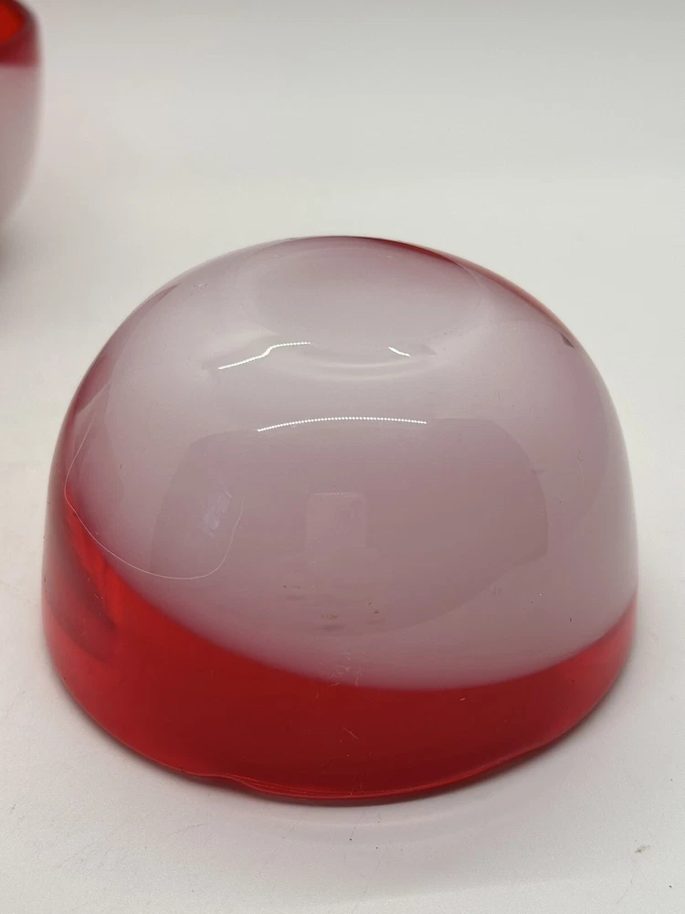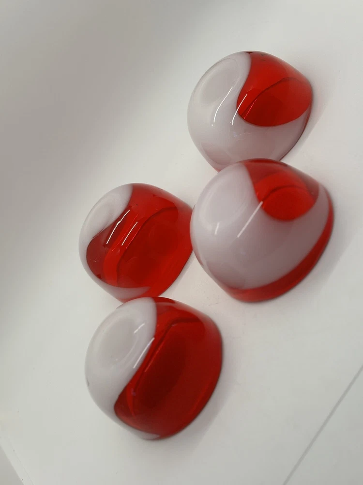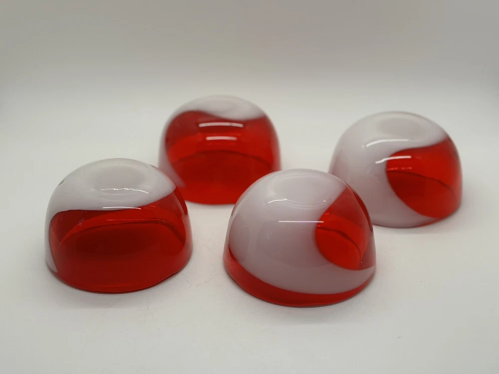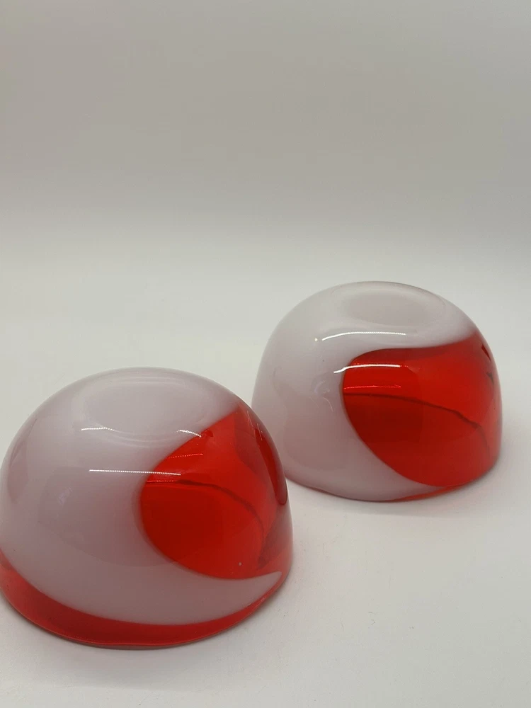 Beautiful set of 4 art glass tumblers / custard cups small bowls a slightly wavy edge A real feel of quality 3 inches across by 2 inches deep One has a chip as shown in last photo.
