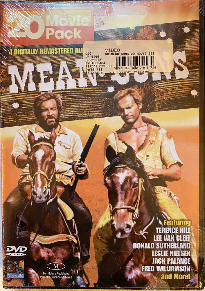Edition:4-Disc Setgtin13:0683904200174Genre:WesternsUPC:0683904200174Format:DVDRating:RMovie/TV Title:Mean Guns-20 PackActor:Donald Sutherland, Lee Van Cleef, Leslie Nielsen, Terence Hill, Fred Williamson, Jack Palance, Dennis HopperType:Movie