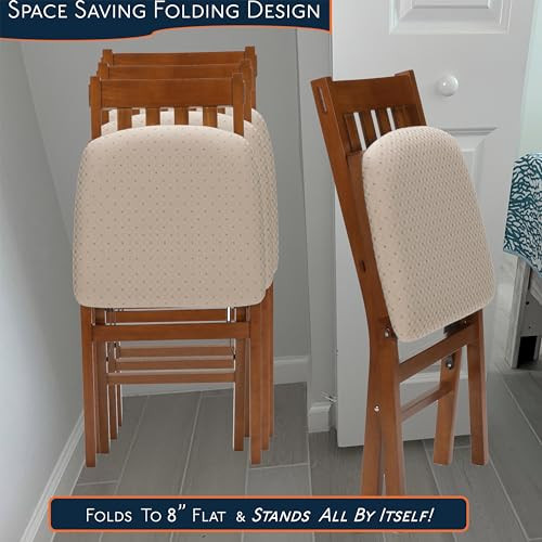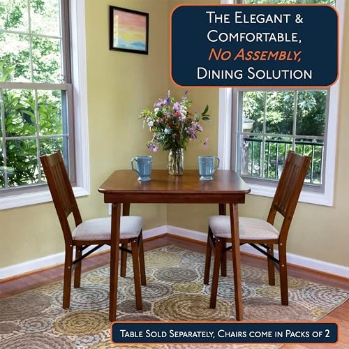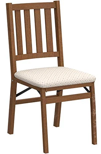 This Arts and Craft Dining Chair embraces the arts and crafts period of furniture with it's wide slats and full threw tenons on the backpost of the chair and will make the perfect extra seating alternative for your home. The chairs are constructed of solid hardwoods with a steel folding mechanism and padded upholstered seat. Premium solid wood construction Blush fabric upholstered seat No assembly required Folds to 8“ deep for storage Seat Height: 19"
