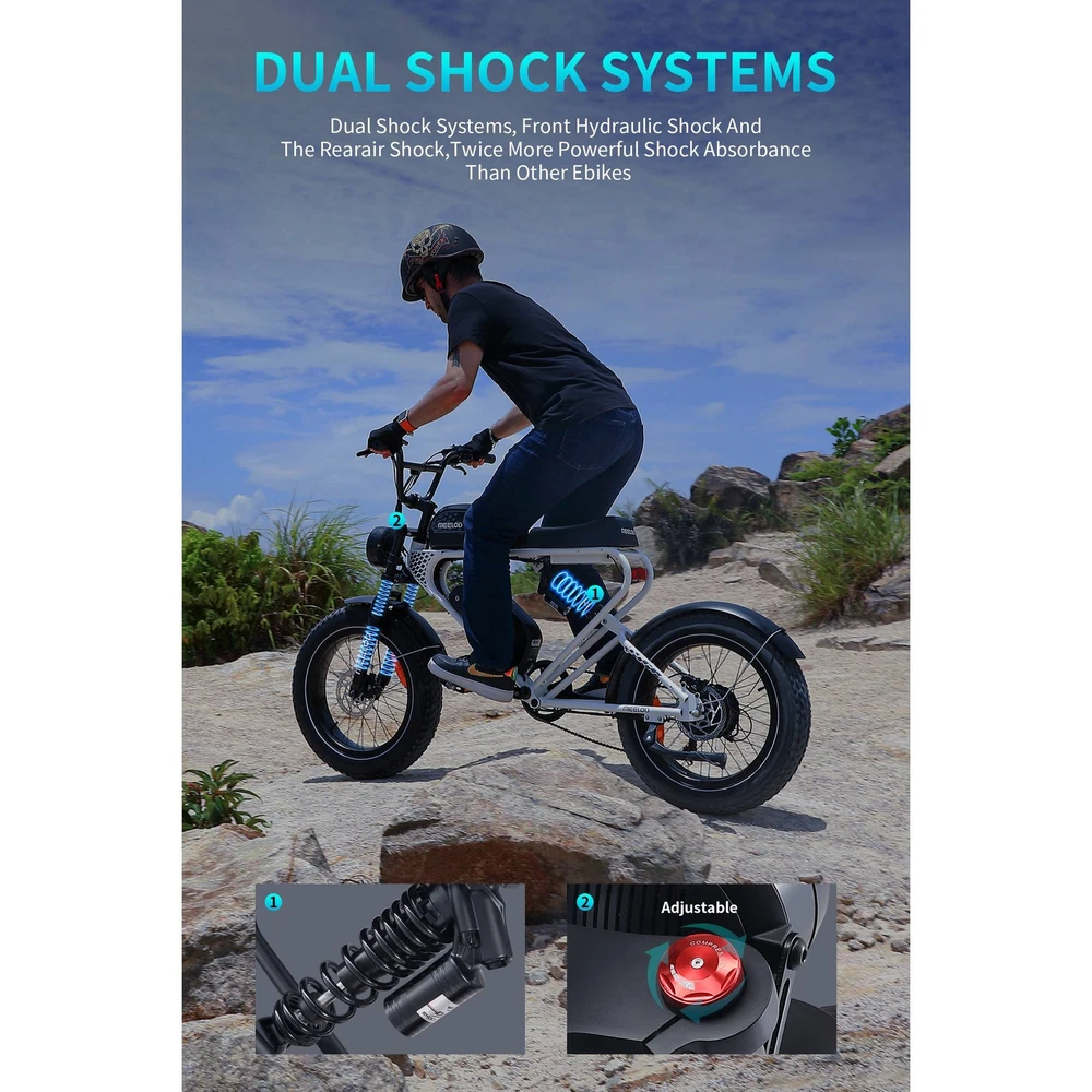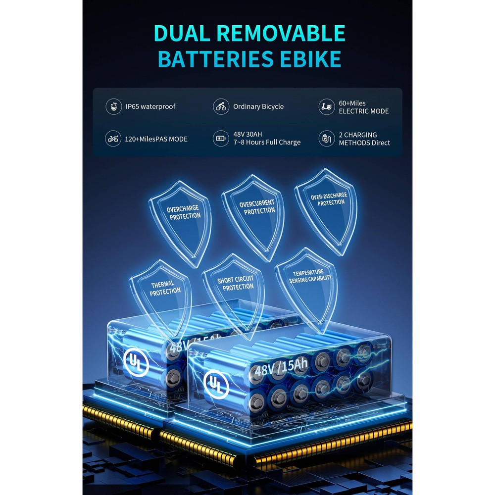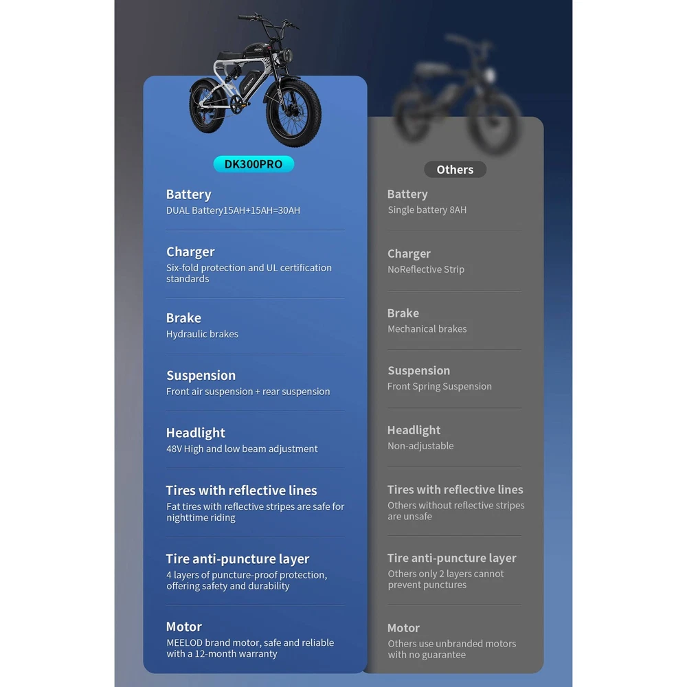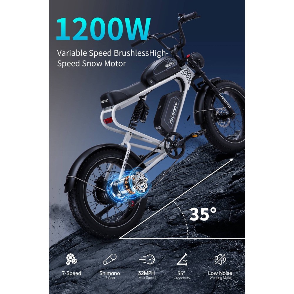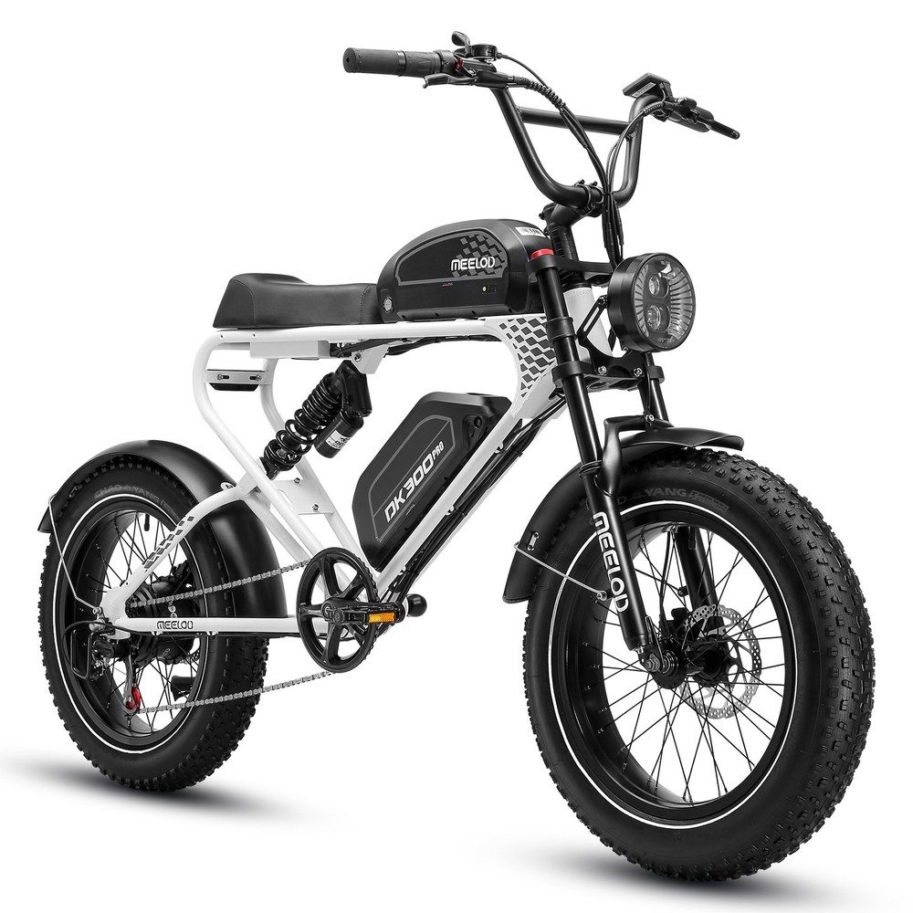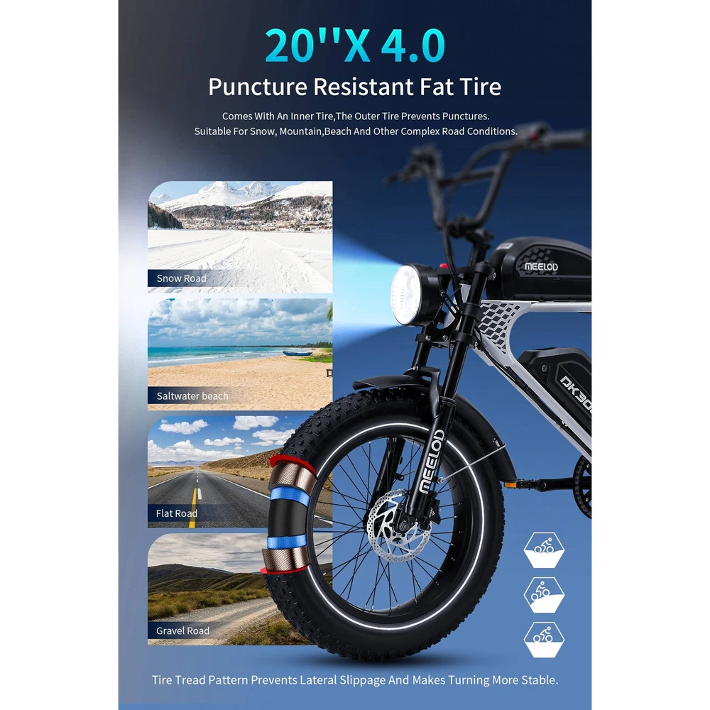 Note: Our merchandise is certified to the UL 2849 standard and supporting documentation is available upon request. MEELOD DK300PRO Electric Bike: Unmatched Power, Performance, and Versatility The MEELOD DK300PRO electric bike is engineered to deliver a superior riding experience, combining cutting-edge technology, robust performance, and rugged durability. Whether you’re navigating city streets, conquering steep hills, or exploring off-road trails, this e-bike is designed to exceed expectations. With its dual-motor power, long-range battery, and premium components, the MEELOD DK300PRO stands out as a top choice for adventurers, commuters, and enthusiasts alike. Product Description 1. [Our Advantage: Reliable Service] Delivery time is only 5-10 days. Shipping within the US is free. After payment, you just wait for delivery. Fast: 95% of Electric Bicycle are assembled before delivery. After receiving the Electric Bicycle, you only need to manually assemble a few parts and start riding. Our customer service response rate is up to 99%. You don't have to worry about any after-sales or pre-purchase issues. 2. [Retro carbon steel frame, full of classic charm] MEELOD DK300PRO adopts a 20-inch carbon steel retro frame, matte black body color, exuding a low-key and unique retro atmosphere, and every line shows classic aesthetics. The sturdy carbon steel material gives the frame excellent load-bearing capacity, with a maximum load of 200kg, which is not only practical, but also makes the whole vehicle full of texture. The retro shape combined with modern design makes the rider stand out from the crowd and become the focus of the street. 3. [Strong power output, long-lasting endurance] Equipped with a 1200W motor, with strong power, rapid acceleration, and a maximum speed of 32 mph, which can easily cope with various road conditions on urban roads. The 48V 30Ah lithium battery, with a high energy output of 624Wh, has a pure electric range of 60-120 miles, which meets the needs of daily commuting and short trips. 7-8 hour fast charging, with a 48V/2A charger, reduces waiting time, making travel efficient and convenient. 4. [Multiple safety configurations, safe and secure riding] The mechanical disc brake system has sensitive and reliable braking, and can stop quickly in an emergency, providing solid protection for riding safety. IP65 waterproof rating, no fear of rain invasion and dust interference, you can ride with peace of mind even in bad weather. The front suspension fork effectively filters road bumps, and is equipped with 20*4.0 snow tires, which have strong grip and stable driving. 6W LED headlights and LED automatic brake taillights illuminate the road ahead and improve the safety of night riding. 5. [Practical and convenient design, thoughtful details] The LCD display clearly displays key data such as speed, power, mileage, etc., allowing riders to keep track of the vehicle status at any time. The rotary throttle is easy to operate and responsive, making it easy to control the speed. The vehicle measures 170*73*93 cm in size, with a compact structure that is easy to park and carry. The net weight of 35kg is both stable and portable, making it easy to use for daily use or short-distance transportation. On Jul 21, 2025 at 12:22:12 PDT, seller added the following information:
