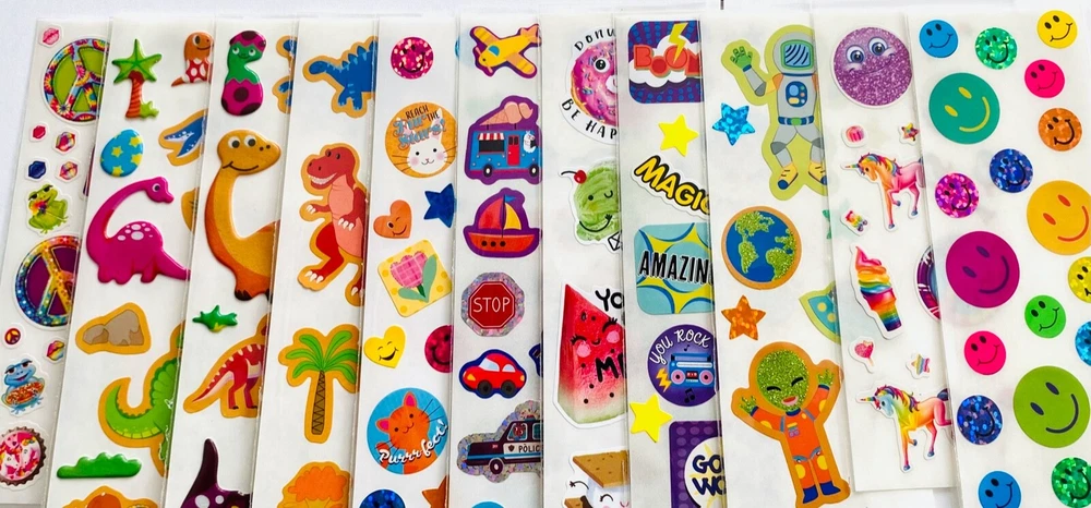 MEGA Mixed Sticker Lot | The Ultimate Sticker Collection | Qty. 555+ Stickers Fun Assortment of Glossy, Glitter, Puffy, Scrapbook, Cartoons, Bubble, 3D, Pop Up, Foil, Metallic Stickers For Everyone! I have included a large variety of pictures of the assortment available. The pictures give you an idea of what you will be receiving. Please Note: You will not receive everything pictured. Please contact me with any special requests. This HUGE Variety of fun designs stickers can be used in parties, classroom, school and home, good for reward for students, potty training, adding inside a birthday card, game activities, entertaining toddlers, etc. Perfect Gifts for Kids & all Occasions: Can be given as a gift for kids, girls, boys, toddlers, teens, students, friends, and classmates, they will love it! Each package of stickers is a different style & theme with some lovely embellishments like rhinestones, ribbons, buttons and other 3D details that make these quality stickers look so unique!