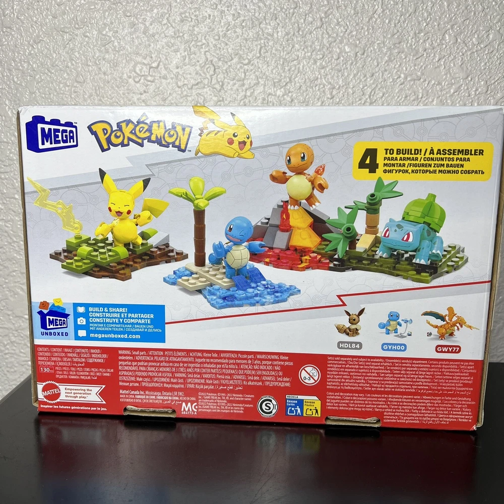 Character Family:PokémonMPN:HFG05Type:Interlocking BlocksNumber of Pieces:130 PcsAge Level:6+Packaging:Original UnopenedFeatures:Limited EditionProduct Line:PokémonCountry/Region of Manufacture:ChinaCharacter:Pikachu, Charmander, Bulbasaur & SquirtleBrand:MEGACompatible Brand:For MEGA, For LEGOMaterial:PlasticTheme:TV Shows, Animals, Arts and Crafts, Dragons, Gaming, Movies, Ninjas, Toys, Boys
