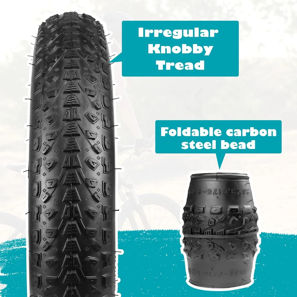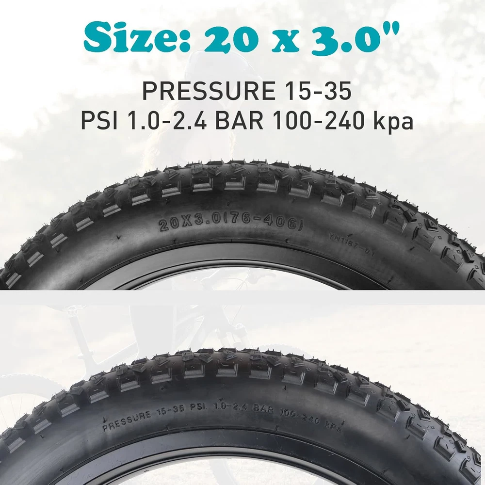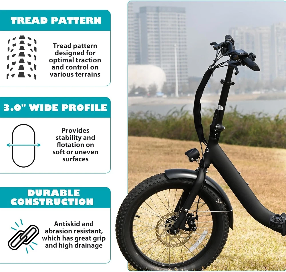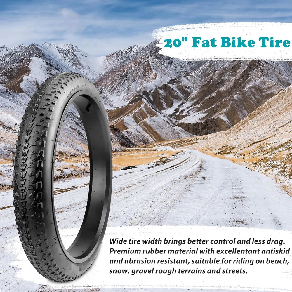 Model: MG-BT-20 x 3.0 inch; 20 inch Foldable Fat Bike Tire for Mountain Bike Snow Bike Electric Bike Tricycle. Specifications: 20 x 3.0 inch; Inflate to 15 - 35 P.S.I, 1.0 - 2.4 Bar, 100 - 240 KPA. Fat tires are very stable when riding, not easy to fall, increase the comfort of riding, and adapt to a variety of roads, such as desert, sand, mud and dirt roads. Package includes outer tire x 1. Please make sure to choose correct tire size before you purchase. Irregular blocks in a group, composed of this knobby pattern tire, improve the grip, maintain the effective contact between the tread and the road, further enhance the tire on the wet road grip, improve driving safety. The ground area is large, which can improve the adhesion ability of the bicycle and enhance the wear resistance of the tire. Specially designed arrowlined anti-slip tire knobby, grooved combined, greatly improves the drainage performance, maintains excellent grip on the wet road, ensures stable riding, and makes the rainy day no longer an obstacle, but another exciting experience. Steel Wire Inside: The use of high-quality steel wire construction, give the tire stronger durability and wear resistance, whether it is on mountain road, city streets, or on beach coast, this tire takes everything in its stride and lasts a long time. NOTE: This bike tire can be folded, the package includes bike tire x 1, both front and rear wheel can use it, the direction of the middle pattern is for front.