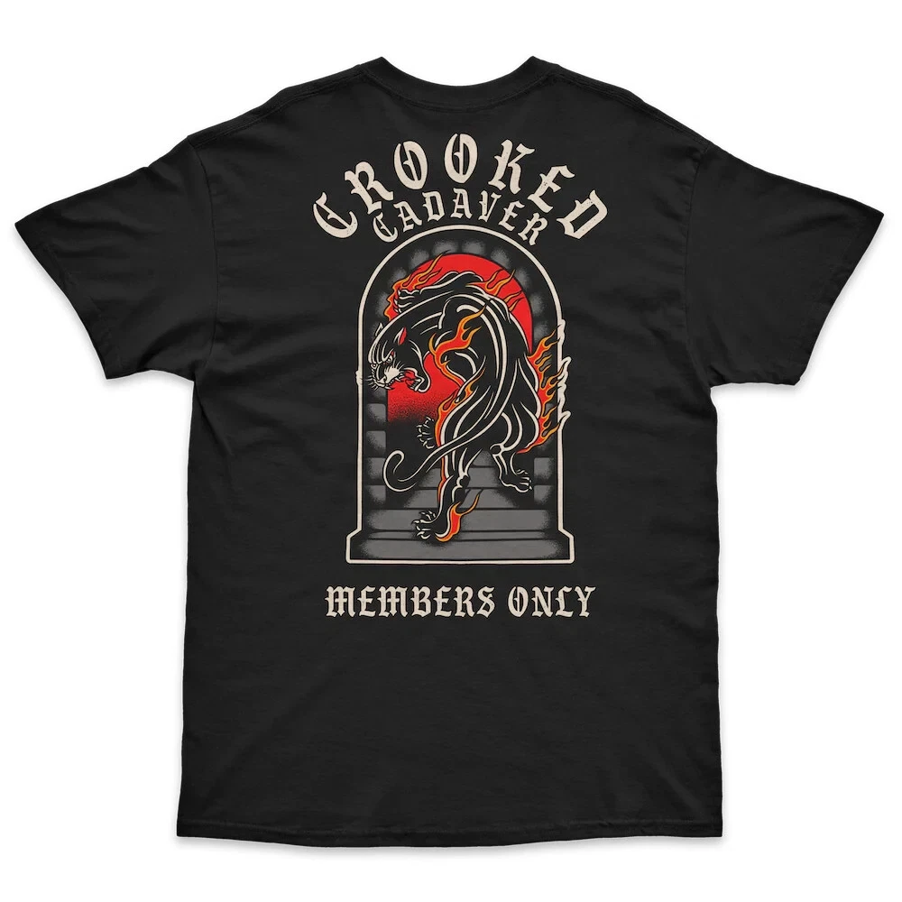 MEMBERS -BLK PANTHER MENS BLK TEE P/N TMEMB-B-L/XL MEMBERS TEE Join the clubhouse and show off your style with the Members Tee from Crooked Clubhouse. This black tee features a sick design on back and front, making it perfect for any casual occasion.