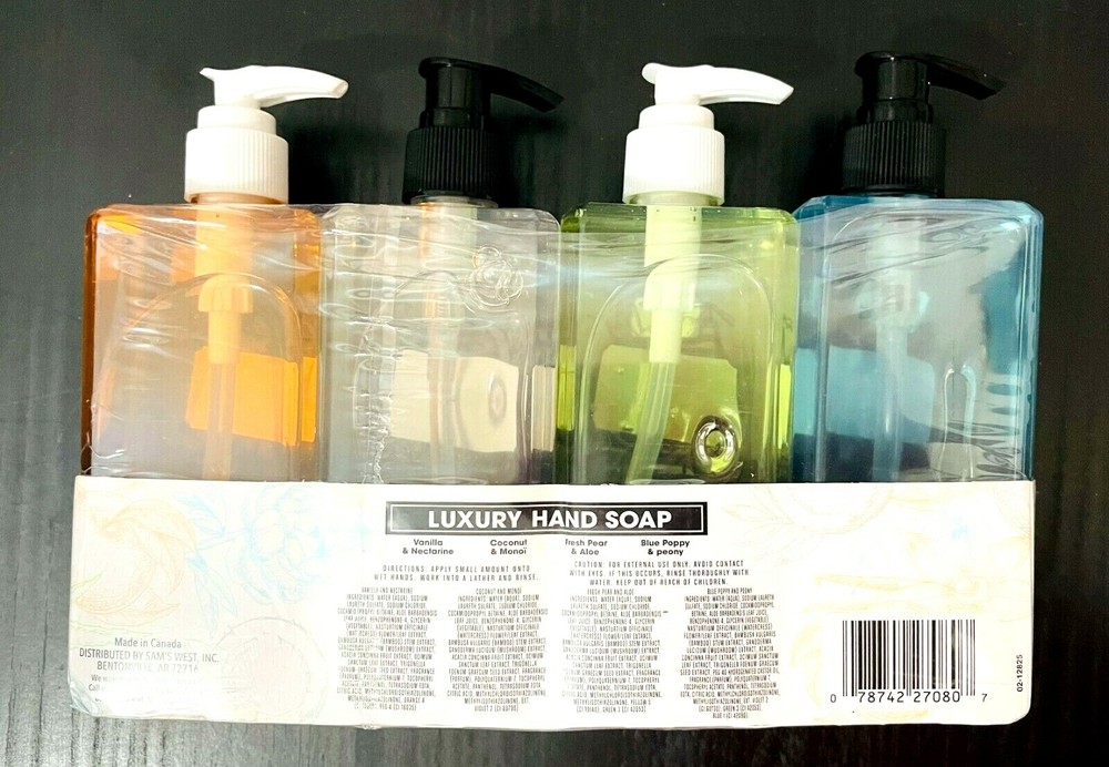 MEMBER'S MARK LUXURY HAND SOAP, FRANGRANCES, VARIETY PACK 13 fl. oz, 4 PACK. Brand New in Sealed. Item Exactly Shown In The Pictures Article Description Member's Mark Luxury Liquid Hand Soap gently cleanses while keeping your hands moisturized and soft. With four different scents to choose from in one variety pack, you can enjoy a refreshing burst of cleansing moisture with one of each of the following fragrances: Fresh Pear and Aloe, Vanilla and Nectarine, Coconut and Monoi and Blue Poppy and Peony. v Coconut and Monoi v Vanilla and Nectarine v Fresh Pear and Aloe v Blue Poppy and Peony v Made in the Canada. SHIPPING INFORMATION : v We only ship to the shipping address in PayPal account. Before you pay, please make sure your address in PayPal matches the address you would like us to ship to. If not, please let us know before you send the payment. We will not be responsible for wrong address. v Items will be shipped within 01 business day after we received payment. RETURN INFORMATION : v Please note we DO NOT OFFER REFUNDS for change of mind for the purchase, so before make a payment PLEASE READ DESCRIPTIONS CAREFULLY. **** If the item arrive to you and it shows visible damage as the carrier is delivering to you, PLEASE REFUSE THE DELIVERY so it will be returned to sender and please contact us immediately. **** If you have any question let us know we'll be happy to help you. *** Please visit our eBay store to check out other items for sale! Thank You and Enjoy Your Shopping At Our Store!!!
