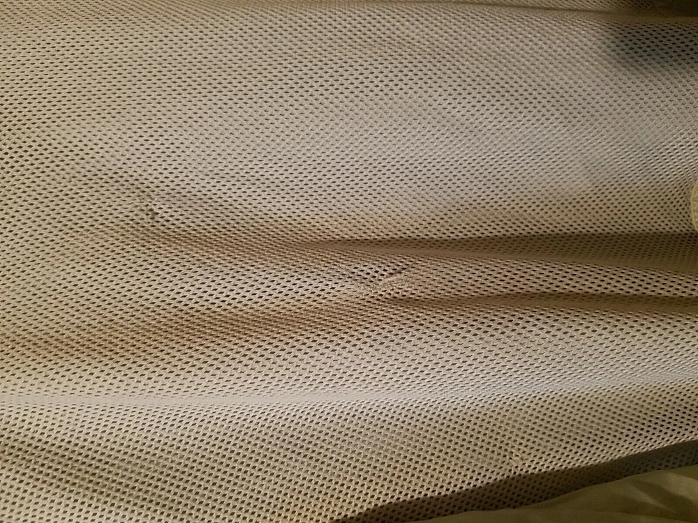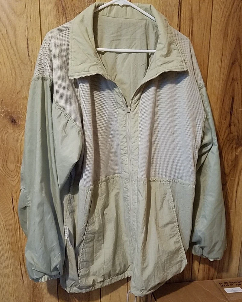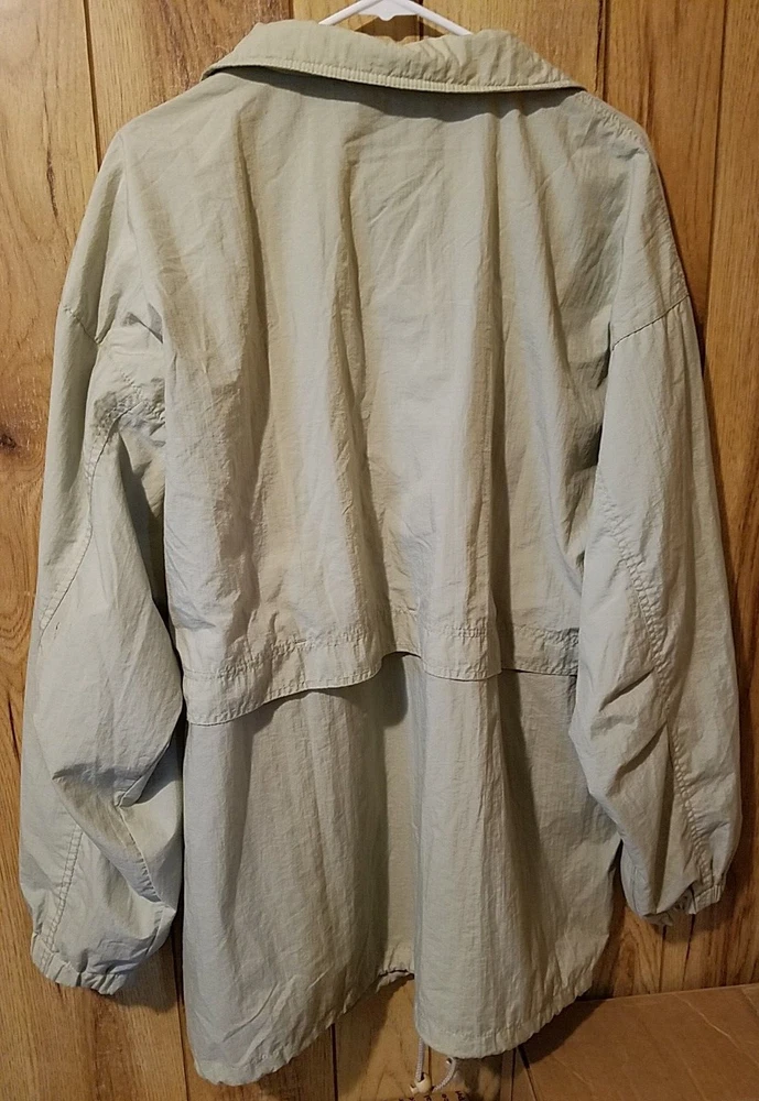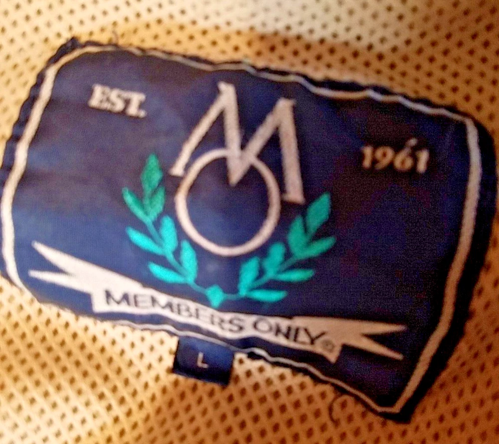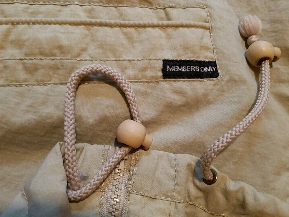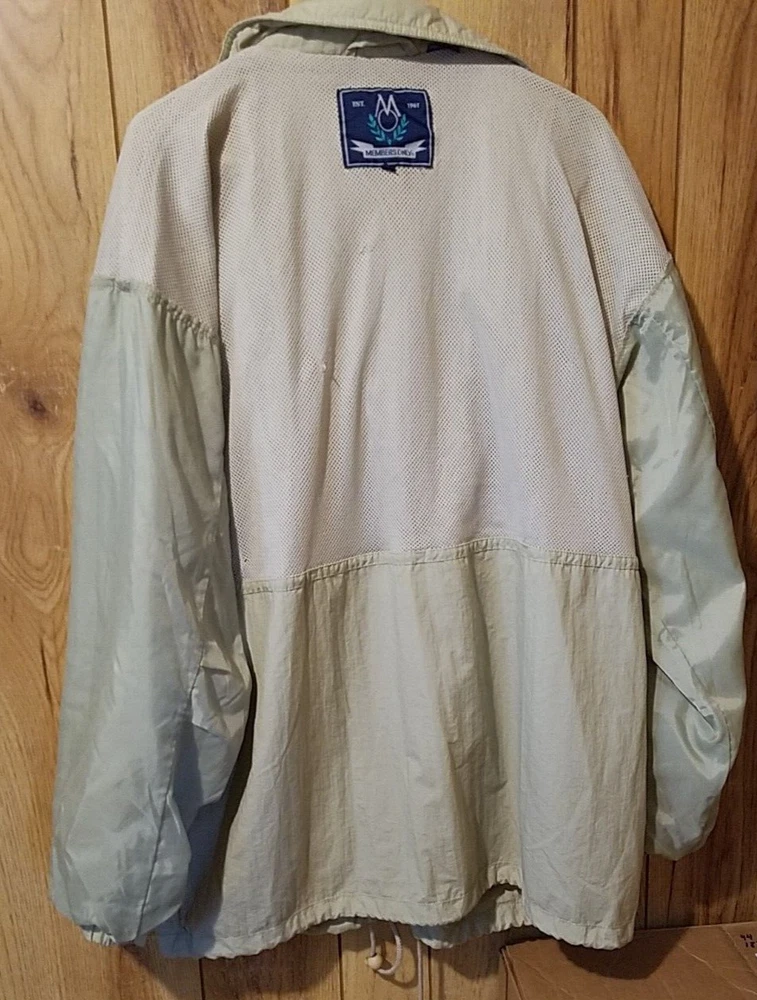 MEMBERS ONLY MEN'S SIZE LARGE BEIGE VENTILATED WINDBREAKER JACKET, ELASTIC SLEEVE CUFFS, 2 FRONT POCKETS, FRONT AND BACK FLAPS WITH MESH LINING FOR VENTILATION, FULLY LINED, FISHING, HIKING, PRE-OWNED, VERY GOOD CONDITION, 2 SMALL "PULLS" IN MESH LINING, NO OTHER DAMAGE