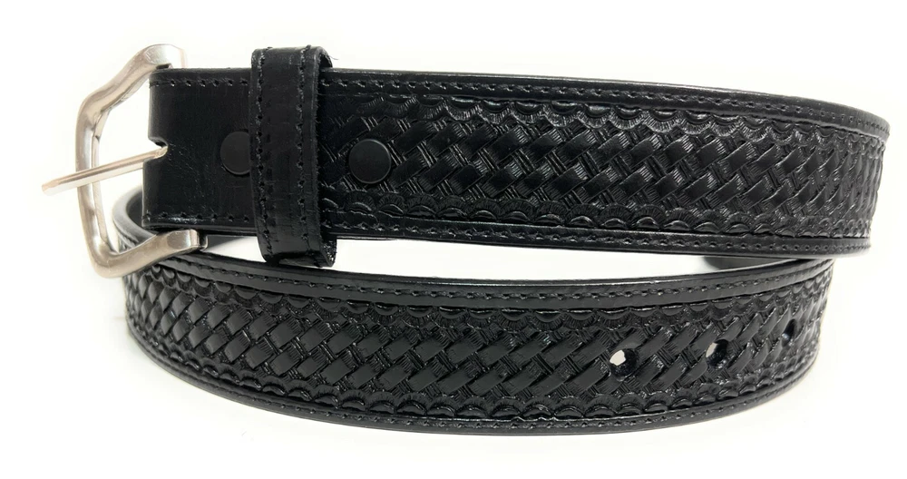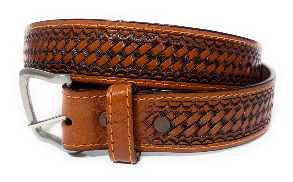THIS IS A BEAUTIFUL HEAVY DUTY BASKET WEAVE LEATHER BELT. 1 1/2 inch WIDE WORK OR CASUAL BELT. GOES PERFECT WITH YOUR JEANS. BUCKLE IS REMOVABLE. SIZE IS TO THE CENTER NOTCH.... FOR EXAMPLE A SIZE 36 IS 36 INCHES TO THE CENTER NOTCH. To accurately order a belt please measure your old belt to the notch you use it on (don’t include the buckle). For example, if it measures 36 inches to the notch you use it on go with a size 36. Belt size in average is 2 sizes larger then your pants size.....for example if you use a size 36 pants you would need a size 40 belt.