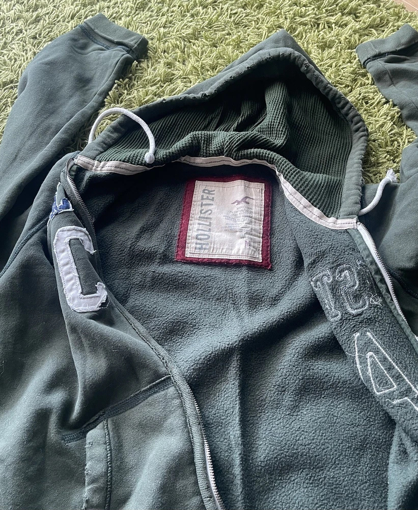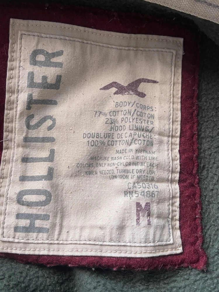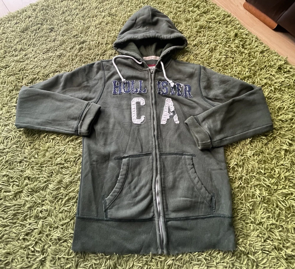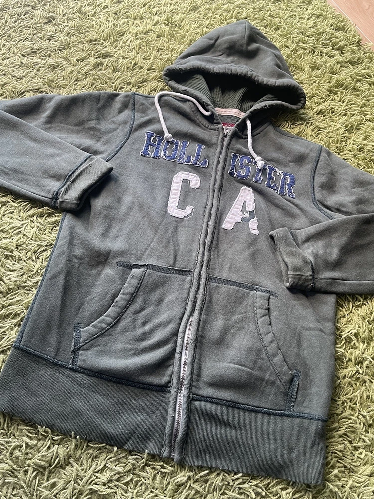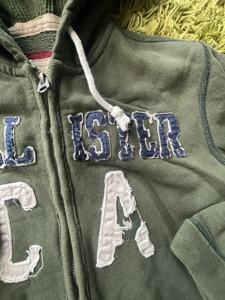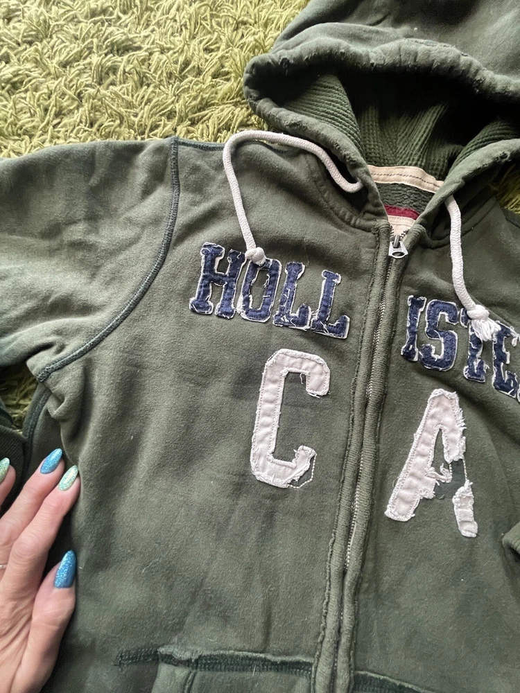 Elevate your wardrobe with this stylish Hollister hoodie in khaki green. Featuring a distressed look, this zip-up hoodie is made of comfortable jersey cotton material and has a crew neck with long sleeves. The hoodie has a regular fit and comes in size M. This full-zip hoodie has many features such as graphic print, lightweight, stretch, pockets, and is moisture-wicking and breathable, making it perfect for all seasons. The hoodie also has accents such as an embroidered logo and a zip closure. It's machine washable and easy to care for. Get your hands on this stylish and comfortable hoodie from the Hollister product line today!