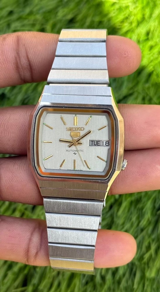 This watch is modified and refurbished the product is a vintage Seiko 5 automatic wristwatch with a square steel case and a silver bezel and bracelet. It features a mechanical automatic movement with 17 jewels and day/date display. This classic timepiece is a timeless piece of jewelry for men who appreciate vintage luxury watches.