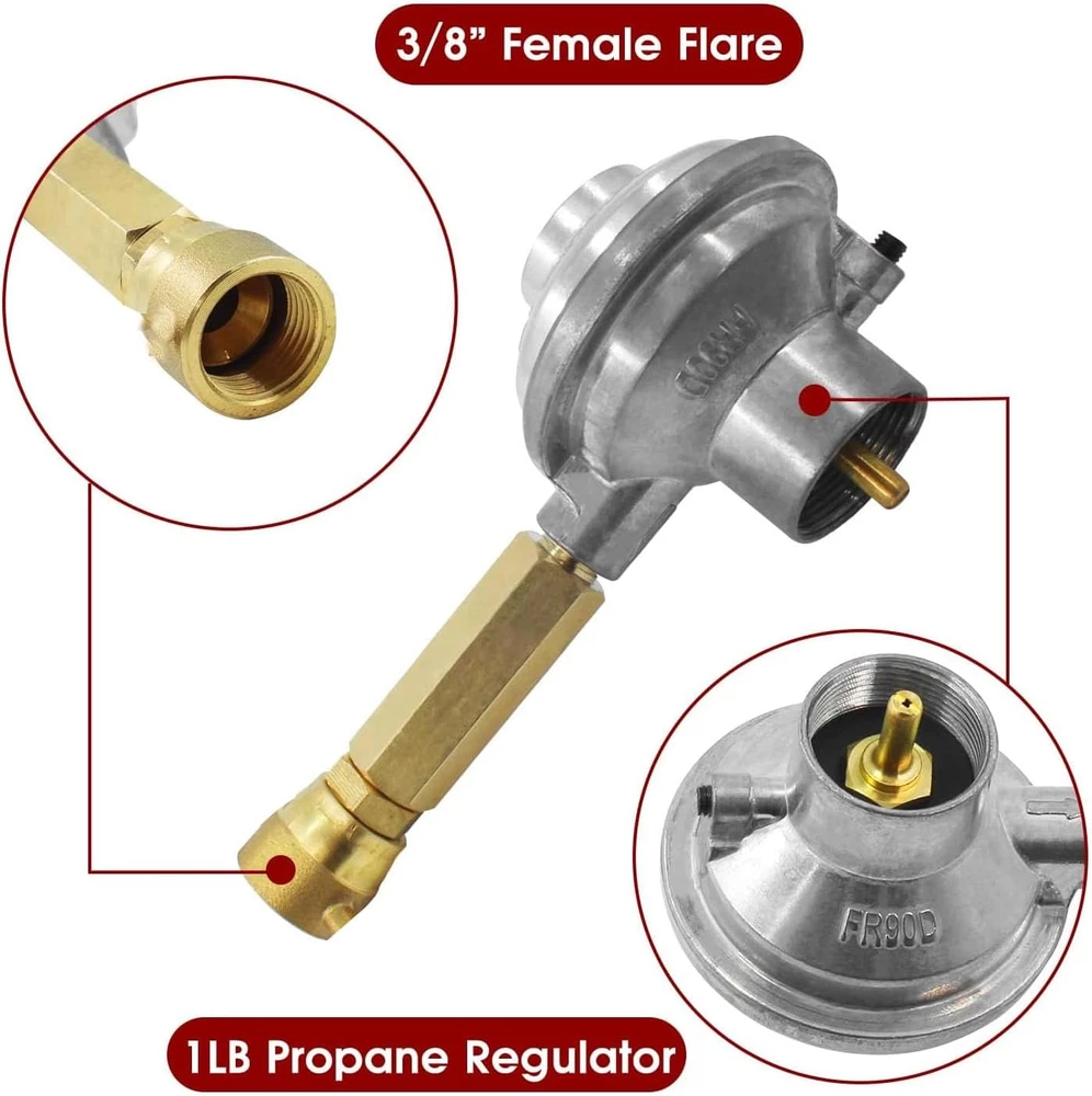 Store New Arrivals Add to Favorite View Feedback Contact MENSI Update Version 1LB Propane Regulator for Grill with 3/8" Female Flare Description Item Weight 5 ounces Package Dimensions 3.31 x 3.31 x 2.28 inches Manufacturer MNS Convert your low pressure grill with 3/8" female flare fitting to a 1lb propane throwaway cylinder tank connection Outlet with 3/8" Female Flare Adapter with Handle Easy Connect Your Grill By Hands shaft 2inch long It Helps You Convert Your Grill, Fire Pit with 3/8 Male Flare Ends Connecting 20-50Lbs Tank to a 1 Pound Propane Tank Easily No Extra Tools Needed Just Fixed by Hands and Save work instead of Carry Big Propan Tank Connect Any Propane Gear Like Grill, Heater, Fire Pit with 3/8" Male Flare Connector and Makes Grilling More Easy to Use One Pound Propane Tank Bottle Product Description Non-Adjustable Low Pressure Gas Regulator Inlet Pressure:25-250 PSIG Outlet Pressure: 280mmH2O=11"" W.C. Flow Capacity:1.5kg/ hr Inlet Connection: 1"-20UNEF Outlet Conection: 5/8"-18UNF BTU: 71400 BTU / hr Extension Rod of the bar 2 inches We design this valve is great for using on RV motorhome grills and heating appliance The long shaft will help you get far from heating area and be more safe and easy connect. Swivel SAE Female Flare Connector with 3/8" Female flare threads with ears which can used to tighten by hands and easy use force. The valve is low pressure setting with 1lb disposal bottle connections to hook the small propane bottles, and shaft of bar length 2inch to better connection Swivel female flare connect the adapter male on the gas appliance and easy supply energy by propane tank. ABOUT US We offer the best prices around on high quality products. Our E-store includes media such as books, movies, music and games while offering electronics, toys, sporting apparel, clothing, tools, general home, garden items and more. SHIPPING We are always working hard to ensure your package arrives as soon as possible. Please understand that some factors like weather, high postal traffic, and the performance of shipping companies are outside of our control. We offer free shipping to the lower 48 states and ship within 2 business days of payment, usually sooner. We do not accept P.O. Boxes. Please provide a physical address. RETURNS We offer a 30-Day Return Policy on items which you are not completely satisfied with. You have the option for a full-refund or an exchange of the item. No returns are available on items shipped outside of the USA. PAYMENT We accept PayPal. CONTACT US This page content is yet to come Please ad us to your favorite seller and visit again later Thank You CUSTOMER SATISFACTION We try our very best to make sure every customer is completely satisfied. If there's a problem, message us! We're happy to help.
