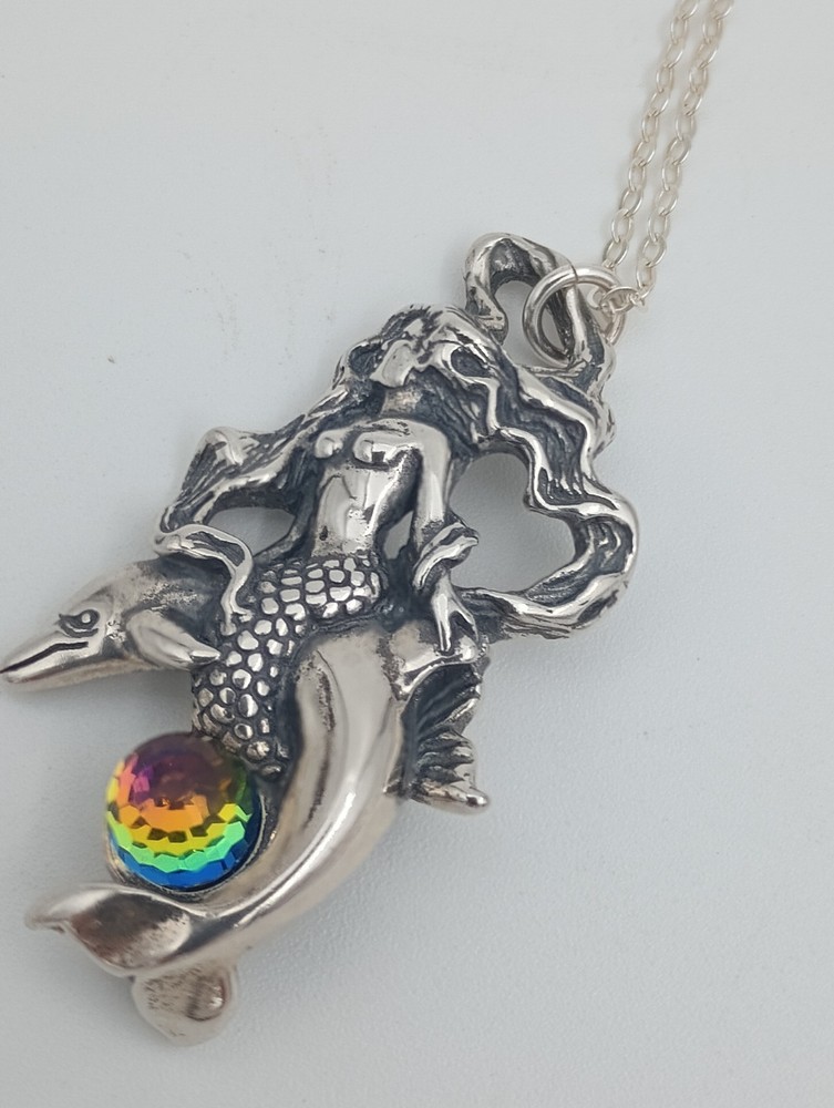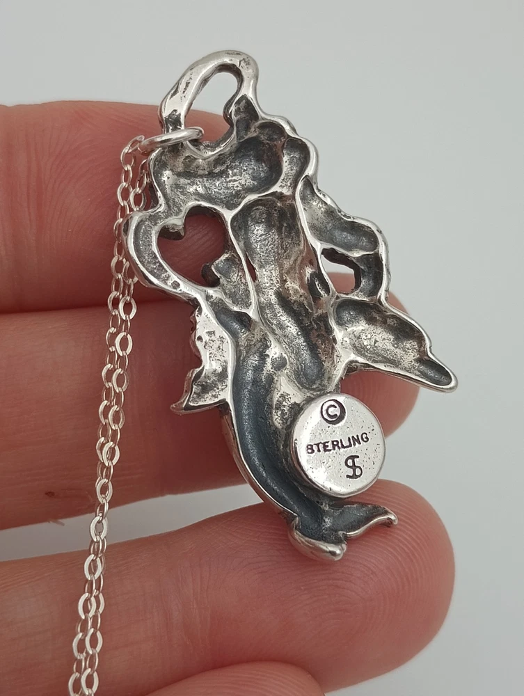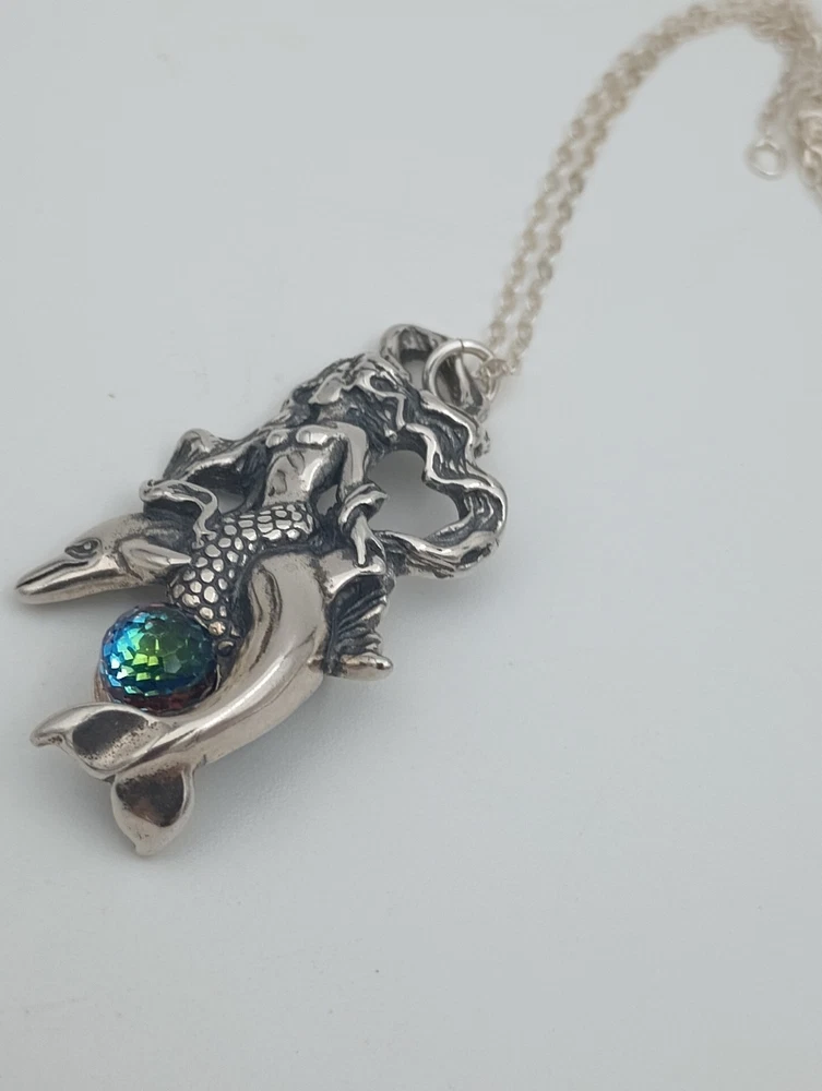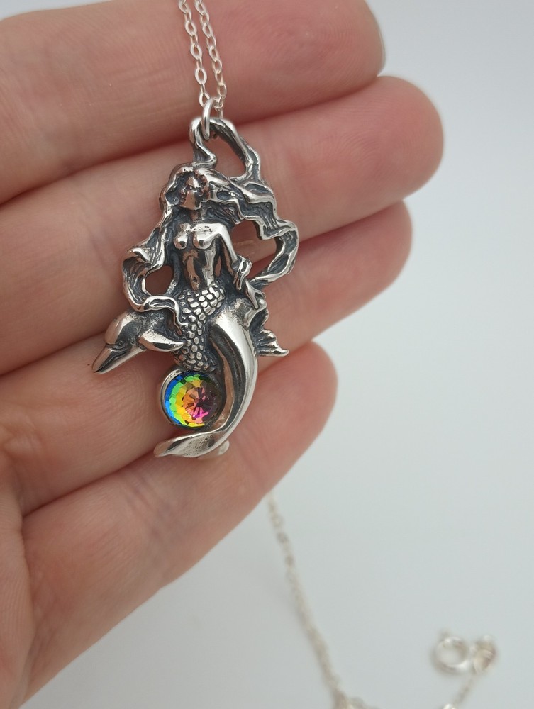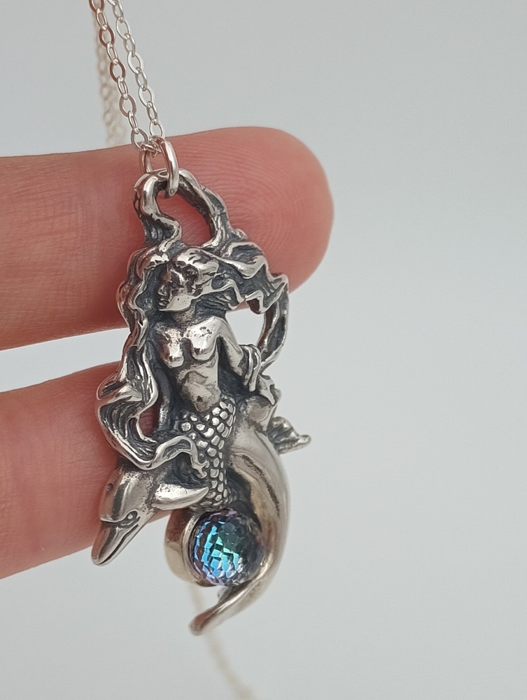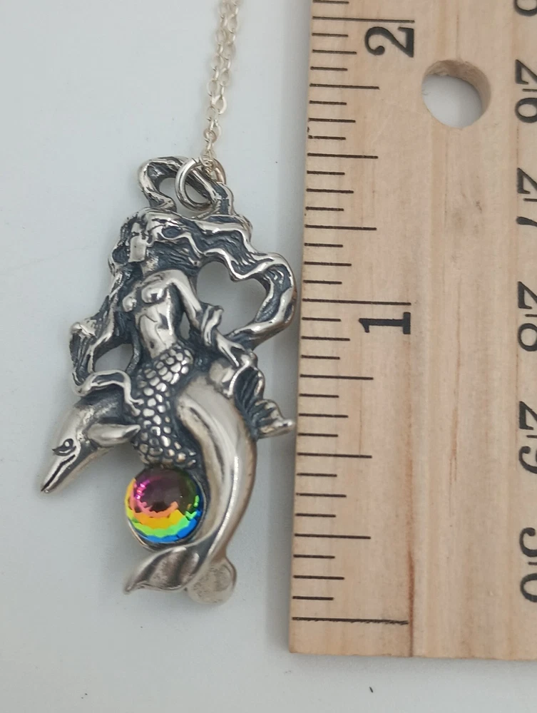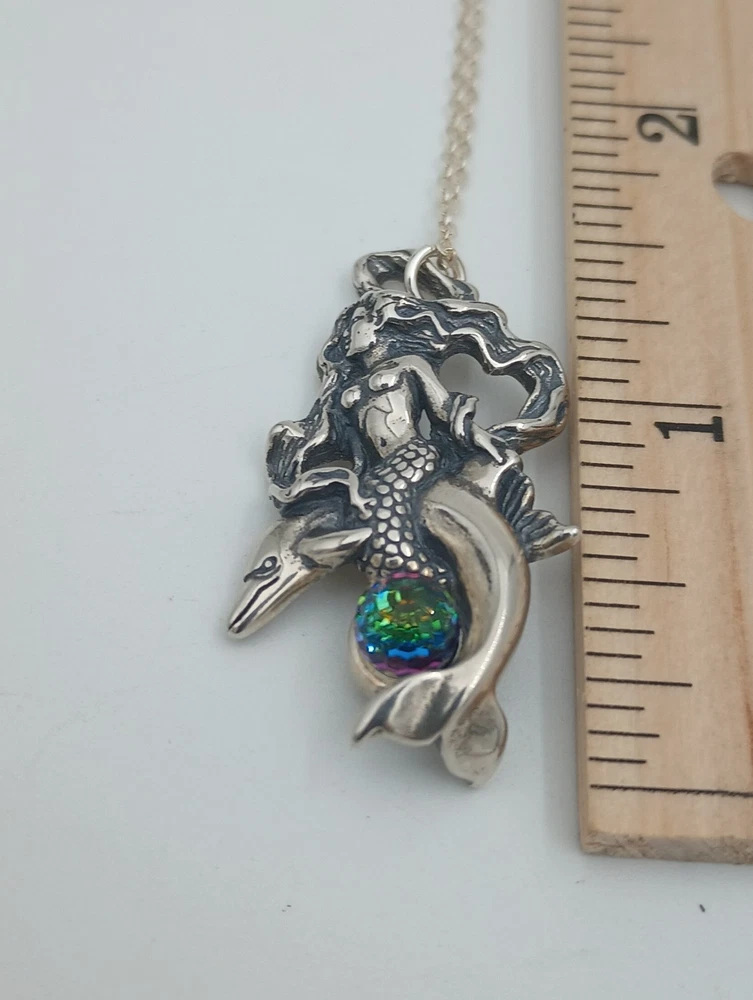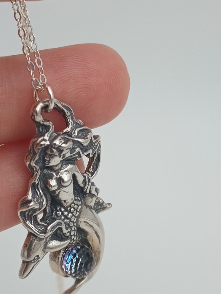 The mermaid necklace is a stunning piece of fine jewelry featuring a sterling silver chain adorned with a captivating mermaid pendant. This stylish and elegant necklace is perfect for adding a touch of aquatic charm to any outfit, making it a versatile and eye-catching accessory for any occasion. The sterling silver material ensures durability and a timeless look, making it a treasure for any jewelry collection. Thank You for viewing! Pendant is made in USA/chain is made in Italy You can request a 16" or 24" chain.