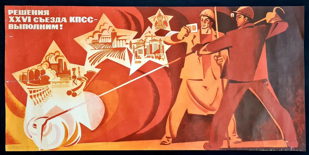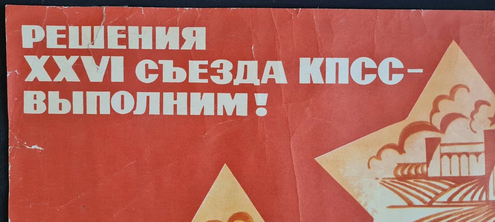 - Original slogans on the poster: РЕШЕНИЯ XXVI СЪЕЗДА КПСС - ВЫПОЛНИМ! Literally English translation: THE PLANS OF XXVI CUPSU CONGRESS WILL FULFILL! border-spacing POSTER ARTIST: SACHKOV VLADIMIR VASILYEVICH SUBJECT: CPSU INDUSTRIAL PLANS PRINT YEAR: 1983 LANGUAGE: RUSSIAN PRINT RUN: 100.000 SIZE: IN: 20 x 46 = CM: 51 x 117 PUBLISHED BY: "PLAKAT", MOSCOW CONDITION: FLAT, NEAR TO GOOD BEFORE YOUR BID PLEASE CONSIDER THE POSTER CONDITION, IF YOU NEED SOME ADDITIONAL INFORMATION PLEASE FEEL FREE TO REQUIRE MORE PICTURES, IT WILL BE MY PLEASURE TO ASSIST YOU WITH ANY QUESTIONS REGARDING ANY AUCTION AT MY EBAY STORE. SHIPPING ROLLED IN A TUBE. - - - Listing and template services provided by inkFrog