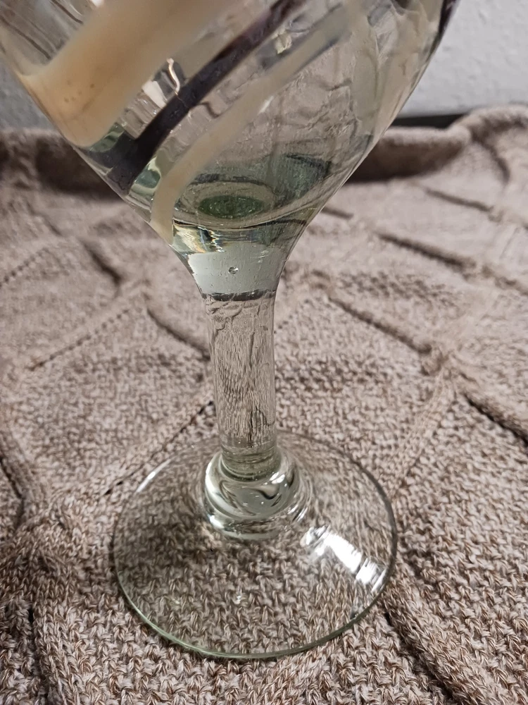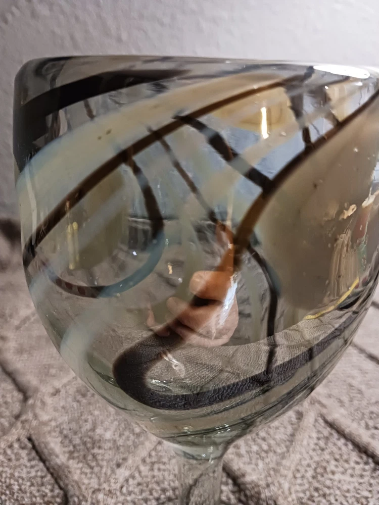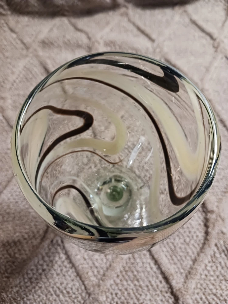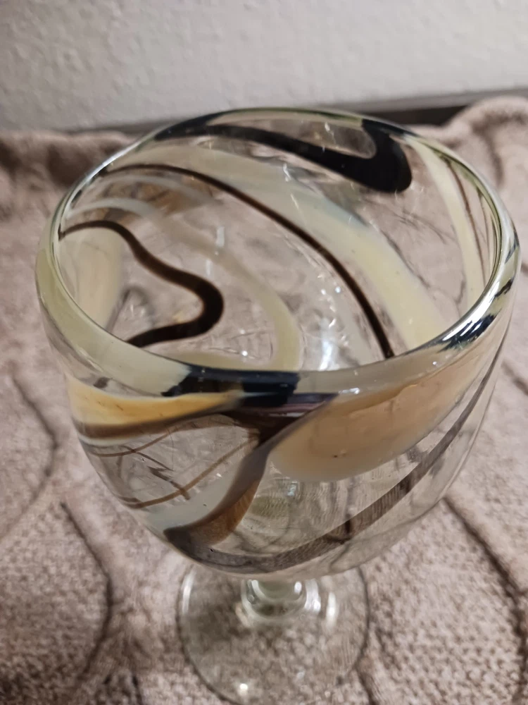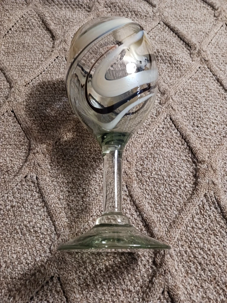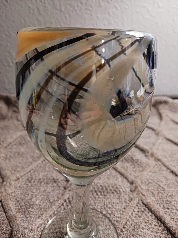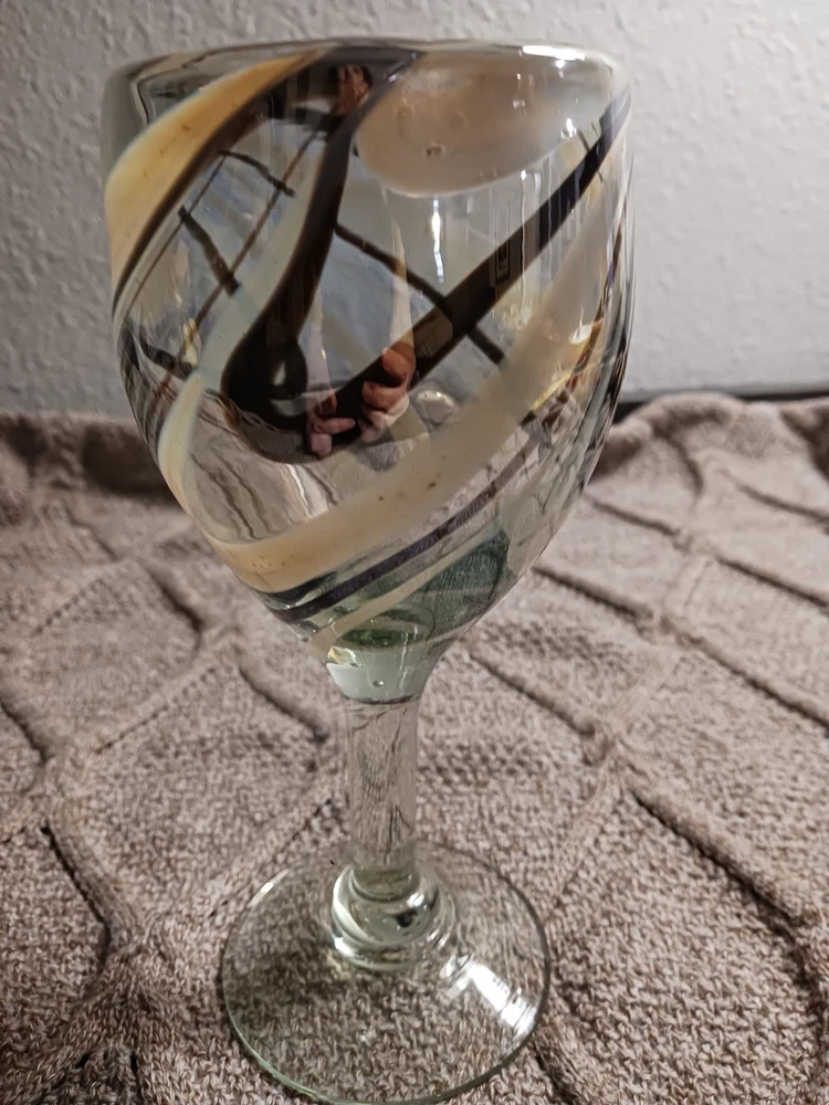 The Mexican Cocoa/Vanilla Gold Swirl Wine Goblet is a hand-blown glass goblet featuring a rustic Mexican design. Each goblet has a swirl pattern in brown and gold colors, with a capacity of 12 oz. The goblet has a height of 7 1/4" and a width of 3 5/8", making them suitable for all occasions. The glassware is from Mexico and should be hand washed only, adding to its authentic and unique appeal. Perfect for enjoying wine or other beverages in a stylish and elegant manner. Like new condition. No chips or cracks