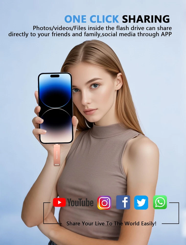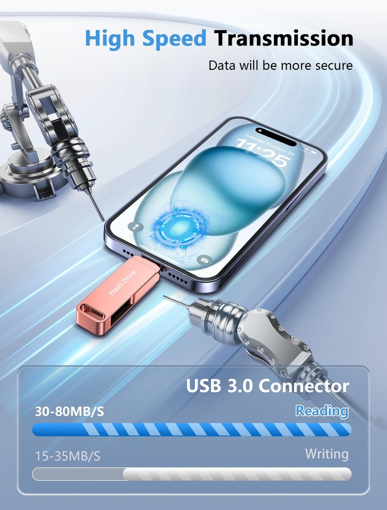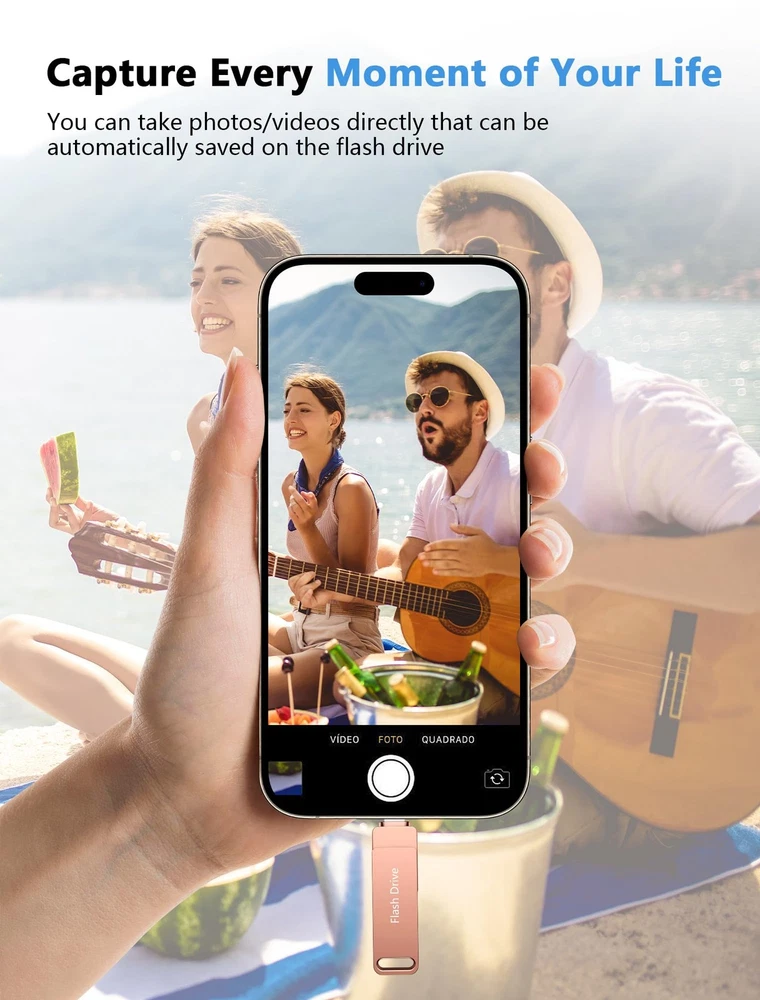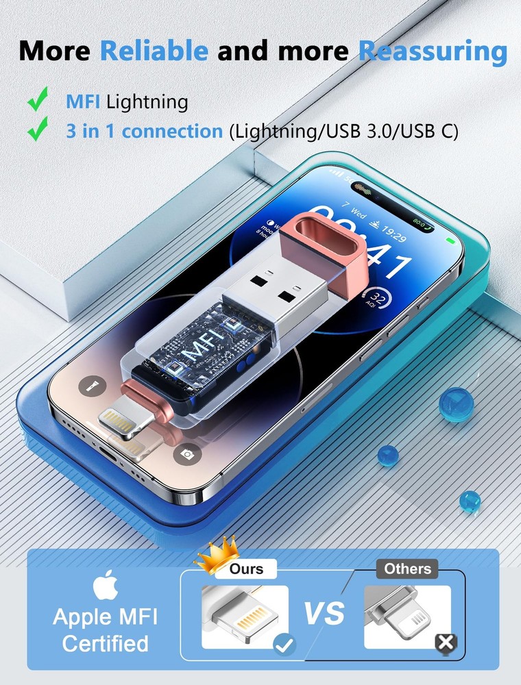 Experience seamless data management with this MFi-certified 512GB photo storage solution. This versatile 3-in-1 USB flash drive is specifically designed for iPhone, iPad, Android devices, and PCs, offering efficient photo and video backup capabilities. The device features high-speed data transfer through quality flash memory chips, making it ideal for handling large files, high-resolution photos, and HD videos. Compatible with iOS 7.1.2 and later, this storage solution works without requiring internet or WiFi connectivity. For enhanced security, the drive incorporates Touch ID and password protection features, allowing both file-specific and whole-drive encryption to safeguard your personal data. The device operates through the 'iExtend+' app for iOS devices, while Android users can simply utilize the OTG function. This practical storage solution effectively helps manage device space by allowing you to transfer large files, thereby optimizing your phone's performance and storage capacity. For optimal performance, it's recommended to remove phone cases during use. π[3 in 1 iPhone Flash Drive] This MFi-Certified 512GB iPhone photo storage stick helps you solve storage issues on your iPhone/iPad/PC, allowing you to easily back up your photos, videos, and phonebook with just one click using the app USB drive. (Note: To use this iPhone memory stick for photos on an iPhone/iPad, please download and install the "iExtend+" app from the App Store. For Android phones, simply enable the OTG function, no need to download any additional apps.) βοΈ [Data Transfer Speed] Enjoy Anywhere: This iPhone USB flash drive for photos uses high-speed ports and high-quality flash memory chips for rapid data transfer, storing your favorite pictures, videos, and music. Whether it's large files, high-resolution photos, or HD videos, it completes the task quickly, saving you time. Seamlessly plug and play via the app on your iPhone or iPad anytime, anywhere. No internet or WiFi required. π[Freeing up phone space]The iPhone USB stick is compatible with iOS devices running iOS 7.1.2 or later, OTG Android phones, computers, and other devices with USB ports. You can transfer unused or large files that occupy a significant amount of phone storage to the USB flash drive for iPhone. This way, you can free up phone storage space, making your iPhone run more smoothly and providing more space for other data and applications. π[ Advanced Security and Encryption]iPhone Photo Stick enjoys advanced security features with Touch ID and password protection to keep your data safe from unauthorized access. It supports file encryption and whole-drive protection with fingerprints or passwords, ensuring your privacy and data security. π[Note] You have the option to encrypt the entire iPhone photo storage APP or specific files. While enjoying the convenience of our iphone thumb drive, you will also receive our high-quality service. If you have any questions or concerns about the received iphone storage flash drive, please feel free to let us know, we provide a PDF manual and reliable after-sales service including helpTo ensure the stability of data transmission(When using the product, we recommend removing the phone case).