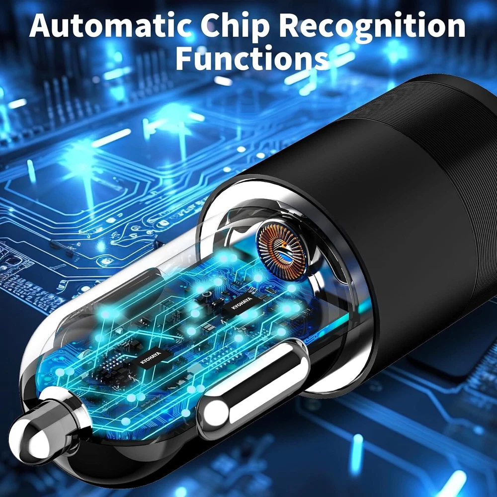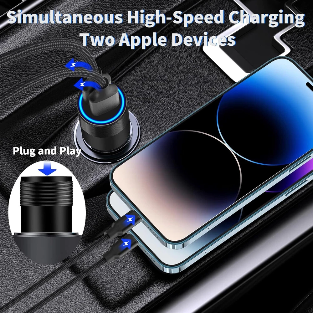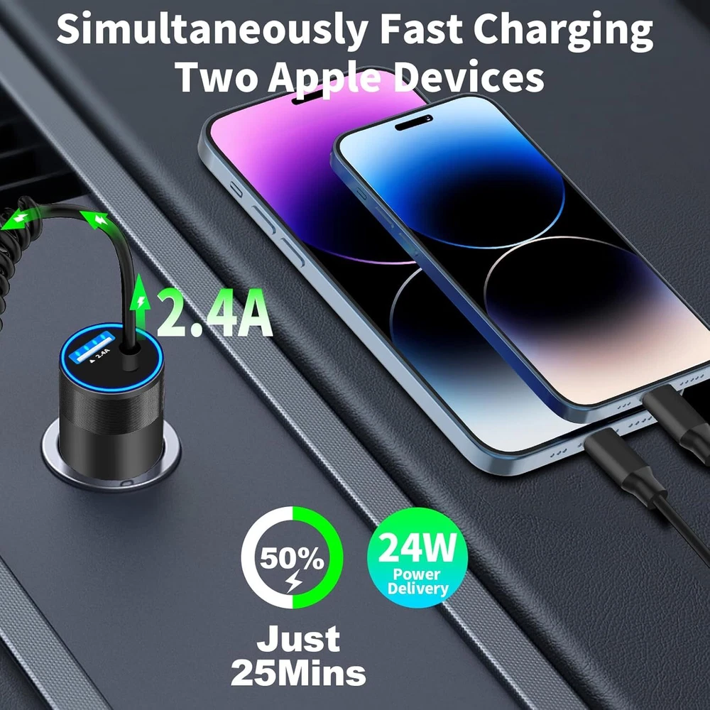 【MFi Certified】iPhone Car 6FT Coiled Lightning Cable(4.8A), Zinc Alloy Black Product Details Package Dimensions: 6.5 x 4.09 x 0.98 inches Item Weight: 2.11 ounces Item model number: CFC68D Connectivity technologies: Lightning, USB, USB-A Special features: MFi Certified Chipset, Original C89 Terminal, 4X Fast Car Charger for iPhone, Intelligent Power Distribution, Embedded in-Vehicle Smart Chip, Built-in High-Tech Chipset, 24W Dual USB Smart Power Fast Car Charger, Intelligent Power Management Chip, 4.8A Super Fast Car Charging, 2 in 1 Car Charger, 56Ω Pull Up Protection Resistor, Overvoltage Protection, Surge Protection, Battery Protector, Automatic Chip Recognition Functions, Dynamic Temperature Sensor, UL/ETL/CE/FCC Certified, Flush Fit Car Charger, Built-in MFi Certified 6FT Coiled Lightning Cable, Dual Soft Orange LED Light, Mini Fast Car Charger, Metal Car Charger, Fast Charger Metal Cigarette Lighter Other display features: Wireless Color: Zinc Alloy Black Whats in the box: KYOHAYA's MFi Certified 4.8A Dual USB Smart Power iPhone Car Charger Fast Charging Adapter. Manufacturer: Dongguan ChiRui Electronic Technology Co., Ltd. Compatible Devices: iPhone 14, iPhone 14 Plus, iPhone 14 Pro, iPhone 14 Pro Max, iPhone 13, iPhone 13 Mini, iPhone 13 Pro, iPhone 13 Pro Max, iPhone 12, iPhone 12 Mini, iPhone 12 Pro, iPhone 12 Pro Max, iPhone SE 2020, iPhone 11, iPhone 11 Pro, iPhone 11 Pro Max, iPhone X, iPhone XR, iPhone XS, iPhone XS Max, iPhone 8, iPhone 8 Plus, iPhone 7, iPhone 7 Plus, iPhone 6s, iPhone 6s Plus, iPhone 6, iPhone 6 Plus, iPhone 5S, iPhone SE, iPhone 5, iPhone 5C, iPad Air, iPad Mini, iPad Pro, iPod, Airpods Pro, Airpods 3/2/1 iPhone 14, iPhone 14 Plus, iPhone 14 Pro, iPhone 14 Pro Max, iPhone 13, iPhone 13 Mini, iPhone 13 Pro, iPhone 13 Pro Max, iPhone 12, iPhone 12 Mini, iPhone 12 Pro, iPhone 12 Pro Max, iPhone SE 2020, iPhone 11, iPhone 11 Pro, iPhone 11 Pro Max, iPhone X, iPhone XR, iPhone XS, iPhone XS Max, iPhone 8, iPhone 8 Plus, iPhone 7, iPhone 7 Plus, iPhone 6s, iPhone 6s Plus, iPhone 6, iPhone 6 Plus, iPhone 5S, iPhone SE, iPhone 5, iPhone 5C, iPad Air, iPad Mini, iPad Pro, iPod, Airpods Pro, Airpods 3/2/1iPhone 14, iPhone 14 Plus, iPhone 14 Pro, iPhone 14 Pro Max, iPhone 13, iPhone 13 Mini, iPhone 13 Pro, iPhone 13 Pro Max, iPhone 12, iPhone 12 Mini, iPhone 12 Pro, iPhone 12 Pro Max, iPhone SE 2020, iPhone 11, iPhone 11 Pro, iPhone 11 Pro Max, iPhone X, iPhone XR, iPhone XS, iPhone XS Max, iPhone 8, iPhone 8 Plus, iPhone 7, iPhone 7 Plus, iPhone 6s, iPhone 6s Plus, iPhone 6, iPhone 6 Plus, iPhone 5S, iPhone SE, iPhone 5, iPhone 5C, iPad Air, iPad Mini, iPad Pro, iPod, Airpods Pro, Airpods 3/2/1 See more Connector Type: USB, Lightning Brand: KYOHAYA Number of Ports: 2 【4.8A Dual USB Fast Car Charger for iPhone】: KYOHAYA's independent output technologies is perfectly compatible with iPhone/iPad, equipped with Dual USB Smart Power which provide a maximum of 2.4A/12W if a single port is used and 4.8A/24W when dual ports are used simultaneously. KYOHAYA's Smart Power Intelligent Distribution System and Pi chipset work in tandem to lower power consumption provides double power density, Directly increase the charging speed of your iPhone by 4 times. 【Dynamic Temperature Sensor】: Embeddable smart chip recognition functions plus latest Intelligent temperature control system provides temperature control, surge protection, short-circuit prevention, Anti-interference multi-shielding core with battery protector supports a safe charge. Features a Dynamic Temperature Sensor which actively monitors temperature, and a Power Tuner Chip which adjusts power output to safeguard your connected iPhone/iPad/AirPods device. 【Multiple Advanced Safety Features】: Certified by MFi, UL, ETL, FCC, CE, ROHS. KYOHAYA's 4.8A/24W car charger adopt with a built-in intelligent power management chip that automatically adapts output power to protect the iPhone device while maximizing charging speed and efficiency. Built-in High-Tech Chip provide over-temperature, over-current, over-charge, over-voltage protection, and automatic chip recognition functions protect your iPhone/iPad battery well from damages.