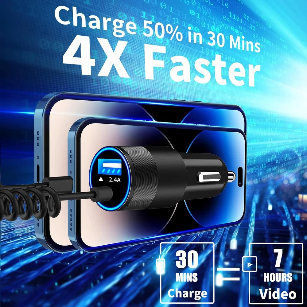 【MFi Certified】iPhone Car 6FT Coiled Lightning Cable(4.8A), Zinc Alloy Black