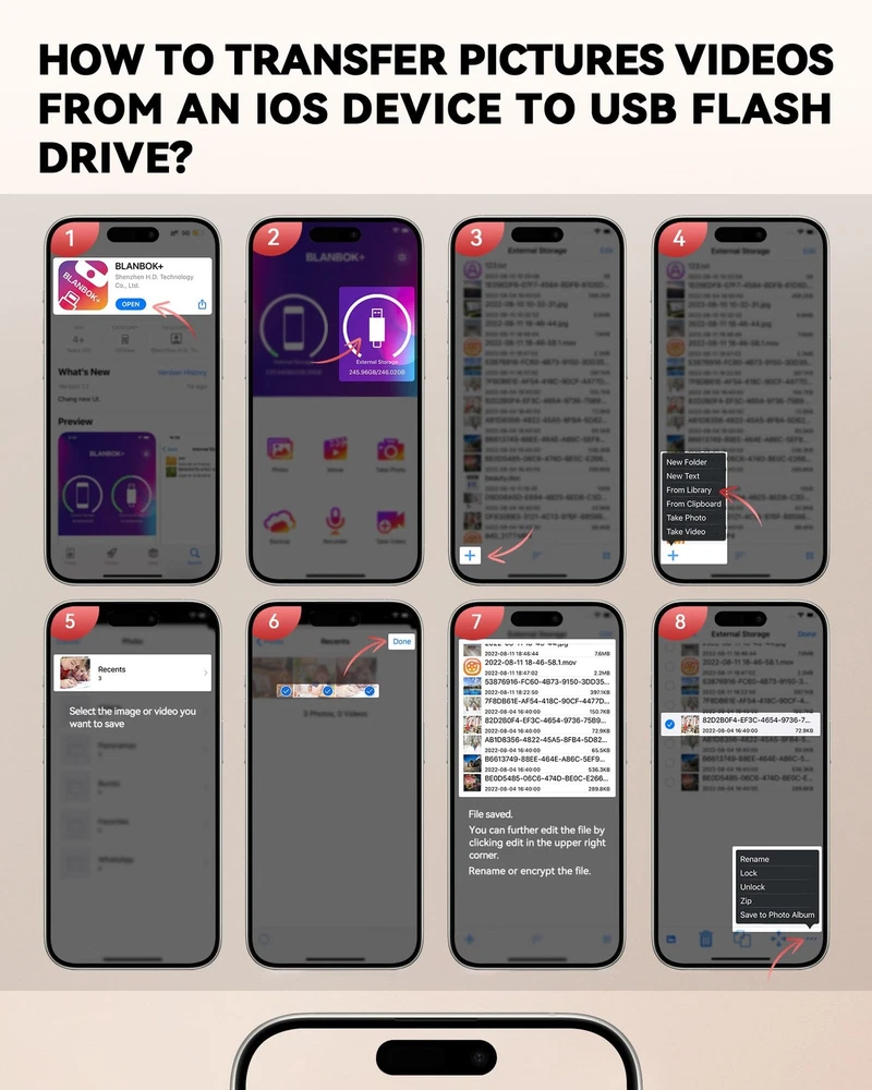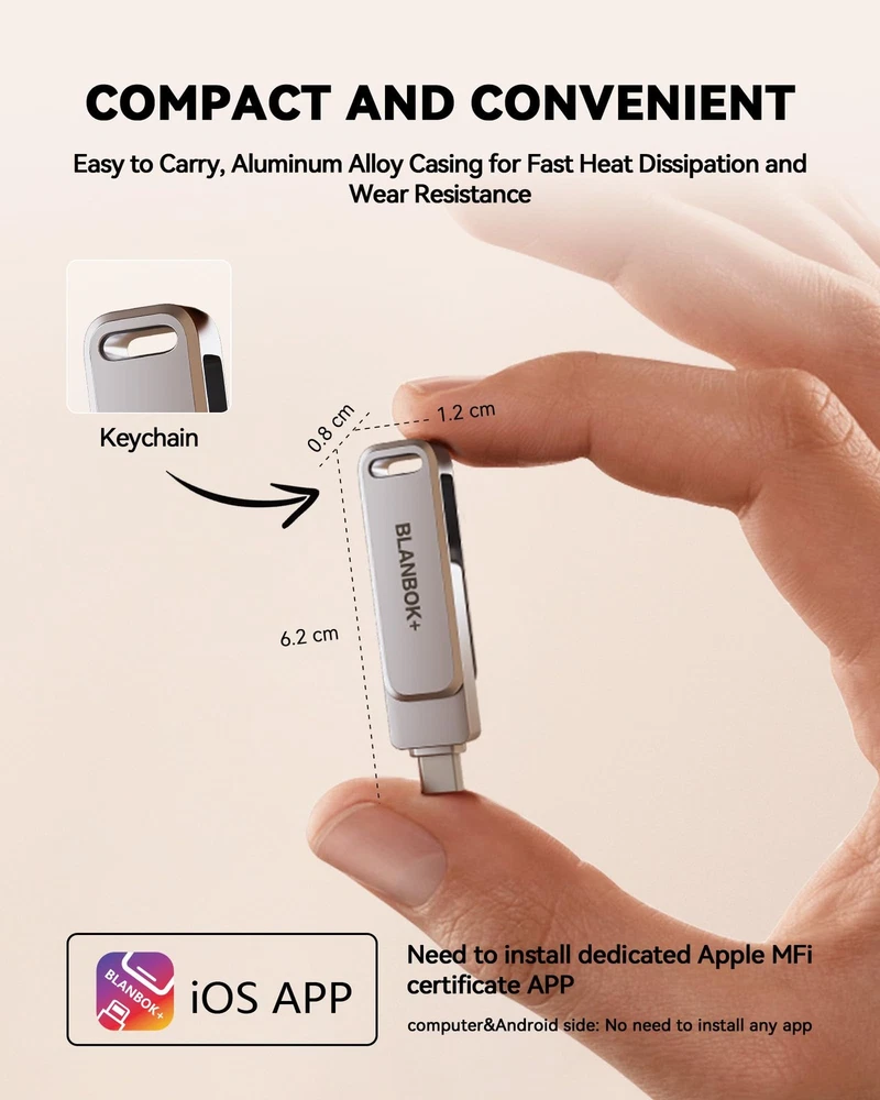 BLANBOK+ MFi Certified USB Thumb Drive - Allows You Share Data Between Various Devices Easily Multi-Interface Design: BLANBOK+ memory stick comes with iphone port/Type C/USB A (independent adapter), compatible for iPhone/iPad/OTG Android/PC and other devices with standard USB ports, can transfer data between various devices, easily complete data sharing. Lightweight & Portable: iPhone storage flash drive size is 2.5 * 0.5 * 0.3 inches, small and exquisite, which is convenient for us to carry. Sleek and Durable Metal Casing Photo stick features a stylish yet tough metal casing that protects the jump drive from unexpected knocks. A compact design makes it easy to slip the thumb drive into your pocket, bag, or purse to prevent loss. High-Tech Chip Smart upgraded chip, its read speeds up to 40m/s and write speeds up to 80m/s, efficient and stable. Mfi Certified flash drive with upgraded chips and unique looks provide you with a more efficient storage experience. Wide Compatibility The usb storage flash drive supports a variety of format files, making it more versatile and no longer limiting the freedom of transmission. Supported System --- iOS 7.1.2 or above /Macos /Windows / Android Plug and Play: Share your photos, videos, songs and other files between iPhone picture stick easily. You don't have to pay extra for additional storage, just insert iphone external storage and enjoy the extra space of your flash drive. One-Click Backup: You can easily backup with one click and manage files at any time. No need of iTunes, manage files, phone address book, pictures and videos through the mobile app to quickly backup to BLANBOK+ flash drive, save the storage space of the mobile phone, and at the same time, operations such as forwarding files on the usb drive can be performed. Protect File Privacy: The General Password & Touch ID can encrypt file information in APP to protect your private files and prevent theft. Convenient and User-Friendly: This MFi-certified 128GB iPhone flash drive allows you to easily backup your phone photos, videos, and phonebook with just one click using the app on the pen drive. You can also backup files to your computer using the USB port, providing double protection. (Note: To use this jump drive on an iPhone/iPad, please go to the App Store to download and install the "BLANBOK+" app. For Android phones, simply enable the OTG function, no need to download additional apps.) Fast Data Transfer: This photo stick for iphone uses high-speed transfer port and high-quality flash memory chips, enabling fast data transmission. Whether it is large files, high-resolution photos, or HD videos, it can complete them quickly, saving your time. Furthermore, it also boasts outstanding resistance to high temperatures, water, dust, drops, and magnetic interference. Its built-in keychain design allows you to carry it with you, preventing loss. Document and Photo Storage: This iphone photo storage stick provides a large storage capacity of 128GB and features Lightning/Type C/USB interfaces (with separate adapters) for convenient data transfer between different devices. No longer reliant on data cables, iTunes, or iCloud, you can securely store important files, photos, and other data. Never worry about running out of storage space on your iPhone again - you can easily store files on the USB drive and access and share them anytime. Freeing up phone space:The iphone memory stick is compatible for iOS devices running iOS 12.1 or later, OTG Android phones, computers, and other devices with USB ports. You can transfer unused or large files that occupy a significant amount of phone storage to the usb flash drive for iphone. This way, you can free up phone storage space, making your iPhone run more smoothly and providing more space for other data and applications. Protect Your Privacy: You have the option to encrypt the entire iphone external storage APP or specific files. While enjoying the convenience of our usb c flash drive, you will also receive our high-quality service. If you have any questions or concerns about the received iphone storage flash drive, please feel free to let us know.