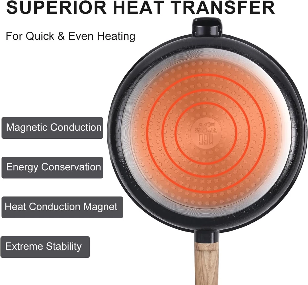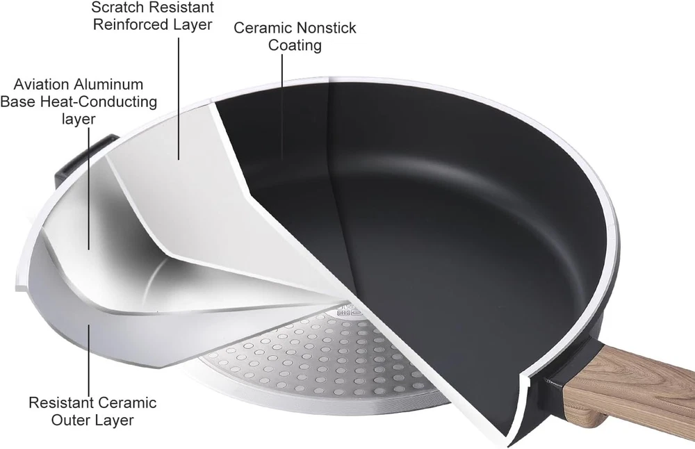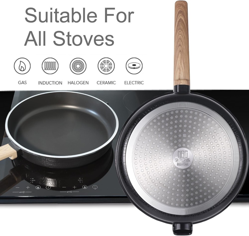 【Healthy Nonstick】:the non stick pans uses Germany C3 + Ceramic Reinforced coating technology,effectively preventing the food from sticking and minimizes oil use,100% PFOA&APEO free. 【Super Easy to Clean】:skillet with lid to its slick non-stick surface, any food particles will easily slip from the pan's surface and minimal scrubbing for a spotless clean, make cleaning easier. 【Suitable For All Stoves】:to let our nonstick frying pan meet the needs of more families, we specially Added and enlarged the induction base delivers quick and evenly heat up and compatible with all stovetops, including Halogen Stoves, Gas, Ceramic, Oven and Electric Stoves. 【Glass Lid & Heat Resistant Handle】:transparent tempered glass lid allows you to monitor the cooking process at any time without opening the lid , heat resistant Bakelite handle grip it comfortably, makes your cooking experience easier and more enjoyable. 【Made to Last】:made of advanced die-cast aluminum technology 6 mm thick bottom and thickened pan body that is 50% longer lasting,this fry pan will surely prove its longevity even after years of use. Dishwasher Safe Simplify your kitchen routine with the dishwasher-safe pan that can handle any cycle, The ceramic coating is durable and resistant to fading or peeling. Oven Safe Enjoy versatile cooking with our frying pan, built to withstand high temperatures in the oven, making it perfect for roasting, baking, and broiling. Easy to Clean The non stick frying pans designed without rivets, any food particles will easily slip from the pan's surface and minimal scrubbing for a spotlessly clean. Stay-Cool Bakelite Handle Soft and comfortable to grip and stays cool while cooking.
