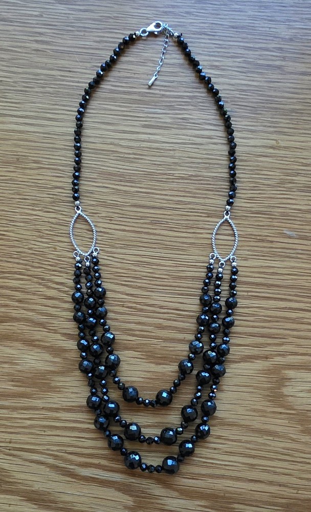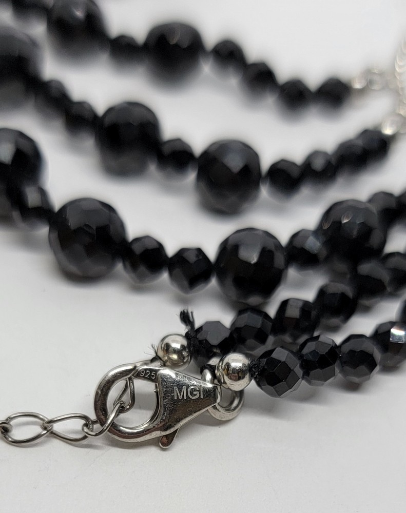MGI Black Spinel (925 Sterling Silver) Faceted Bead Necklace. Necklace is 20-22" in length and in good pre-owned condition. The largest bead is appx. .3" in diameter. See pics for stone markings, imperfections, and variation in color based on lighting. Box not included Please note: This jewelry was originally purchased as authentic (stones and metals) but was not able to be tested nor authenticated after purchase. (Inventory Bin#5100)