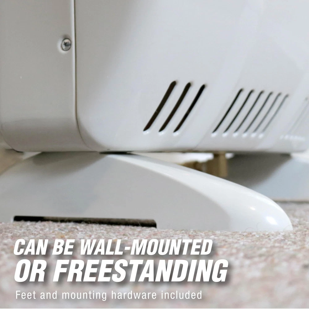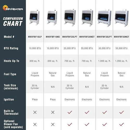 The Mr Heater Blue Flame 20000 BTU Heater with thermostat controlled temperature is the ultimate solution for reliable, supplemental heating for your indoor space, even during the coldest days. Designed to efficiently heat spaces up to 700 square feet, this propane heater uses blue flame burner technology to provide consistent convection heat that circulates warm air evenly throughout the room. Whether you’re trying to warm up your sunroom, cabin, or addition, this unit is perfect for keeping you cozy and comfortable. With the battery-powered electronic ignition, getting the heater started is as simple as pressing a button. Installation is easy and versatile, as this heater can either be mounted on the wall or placed on the floor using the included legs and mounting hardware. This flexibility makes it a great fit for a wide range of spaces and setups. For even greater comfort, an optional Blower Fan Kit (sold separately) is available for 20,000 BTU units and higher, helping to enhance the distribution of heat. For every Mr Heater propane heater safety is a top priority, so this design features an Oxygen Depletion Sensor (ODS) that automatically shuts off the unit if the oxygen levels in the room drop to unsafe levels, providing peace of mind during use. This CSA-certified heater is ideal for cold rooms, additions, and other areas, but is not recommended for use in bathrooms, bedrooms, or recreational vehicles. Additionally, it should not be operated at altitudes over 4,500 feet, as this could cause the ODS to shut down the unit. Whether you need supplemental heat or a primary heat source for smaller spaces, the Propane Heater offers a reliable, safe, and efficient solution for any indoor area. Note: This product is restricted in Canada and California. POWERFUL PROPANE WALL HEATER: Provides up to 20,000 BTUs of heat, effectively warming rooms and cabins up to 700 sq. ft. & designed for reliable performance even at elevations up to 4,500 ft. for consistent warmth in cold conditions EASY CONTROL & IGNITION: This blue flame heater features a thermostat for accurate temperature control and a hassle-free startup with its battery-powered electronic ignition (battery included) & consumes fuel at a rate of .926 lbs per hour SAFE HEAT: of the most important features of this propane indoor heater is the factory standard automatic low oxygen shut-off system (Oxygen Depletion Sensor-ODS) that ensures safe operation whenever in use CONVECTION HEAT: This ventless propane heater features a blue flame burner that uses convection heating, which heats the air, not objects, and disperses that heated air through the area, warming the room from top down, similar to a fireplace VERSATILE MOUNTING: Other wall heaters for indoor use are required to be fixed to a wall where ours is designed for mounted or free-standing use, with legs & mounting hardware included for simple installation to meet the needs of your space