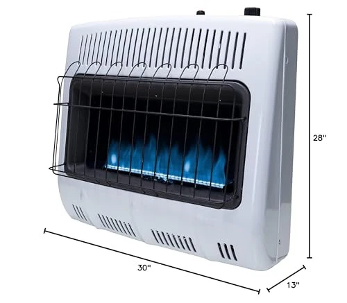 Vent Free Blue Flame Natural Gas Wall Heater is a powerful indoor heating solution, providing up to 30,000 BTUs to efficiently warm spaces up to 1,000 sq. ft. The heaters even convection heat ensures consistent comfort throughout the room. Versatile in design, it can be wall-mounted or used as a freestanding unit on the floor, with all necessary hardware and feet included. The built-in thermostat allows for precise heater thermostat control, while the battery-powered ignition (battery included) ensures easy operation. Safety is prioritized with an oxygen depletion sensor (ODS), which automatically shuts off the heater if oxygen levels fall too low. Suitable for altitudes up to 4,500 feet, this heater is ideal for cold rooms, sunrooms, additions, and cabins. The natural gas room heater comes in radiant or blue flame models, both indoor-safe, and operates on either propane or natural gas. POWERFUL HEAT: This gas wall heater provides up to 30,000 BTUs with natural gas, turning cold rooms, additions, or other spaces into cozy retreats; perfect for areas up to 1,000 sq. ft. and effective at altitudes up to 4,500 feet PRECISE HEATER THERMOSTAT CONTROL: Equipped with a convenient thermostat for accurate temperature adjustment to ensure your space stays comfortable; includes a free battery to power the reliable ignition for hassle-free operation FUEL-EFFICIENT BLUE FLAME HEATER: Delivers efficient warmth with a blue flame burner, consuming just .030 MCF per hour; it ensures consistent convection heat, offering even and energy-efficient warmth while minimizing energy usage SAFE HEAT: This wall space heater is equipped with a low oxygen shut-off system (ODS-Oxygen Depletion Sensor) for reliable and secure operation wherever it’s used DUAL MOUNTING OPTIONS: This natural gas indoor heater features a modern look and its versatile design allows for permanent wall mounting with the included brackets and fasteners or secure floor placement with the included standing feet and hardware