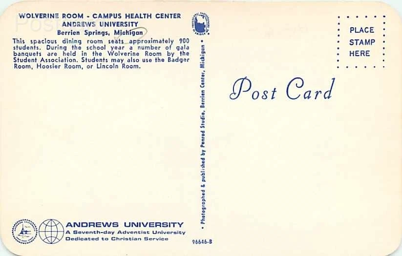 Chrome Postcard Berrien Springs, Michigan, Andrews University, Health Center, Wolverine Room Postmark: None Image: Bright and clean Corners: No wear Faults/Other: SKU: 45370 Powered by SixBit's eCommerce Solution